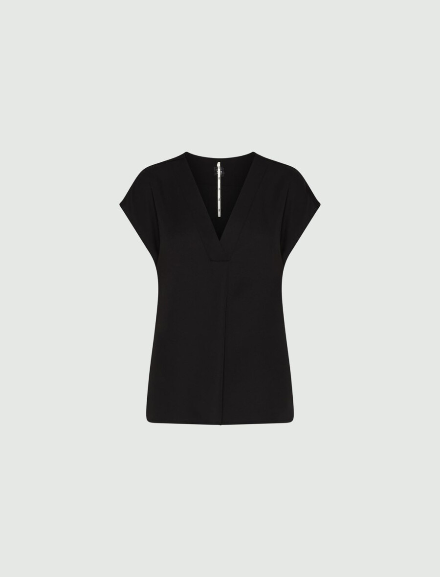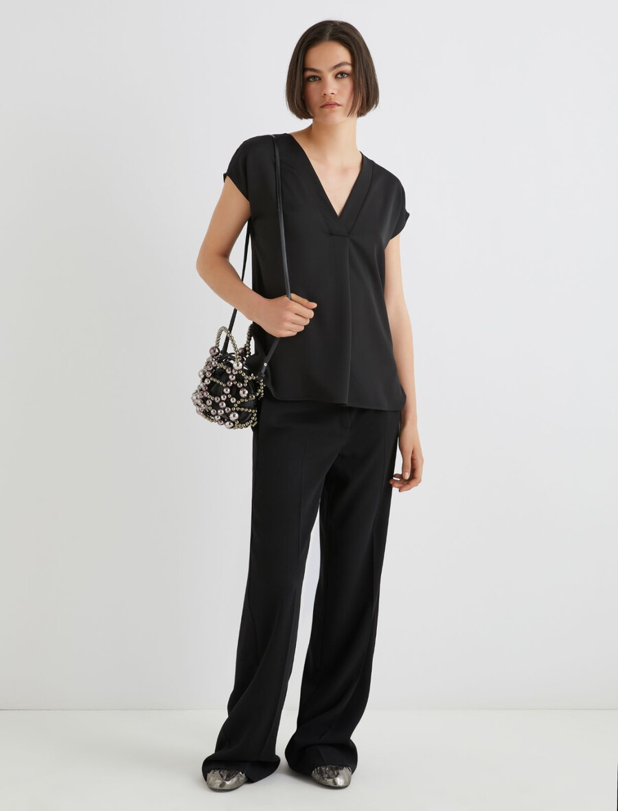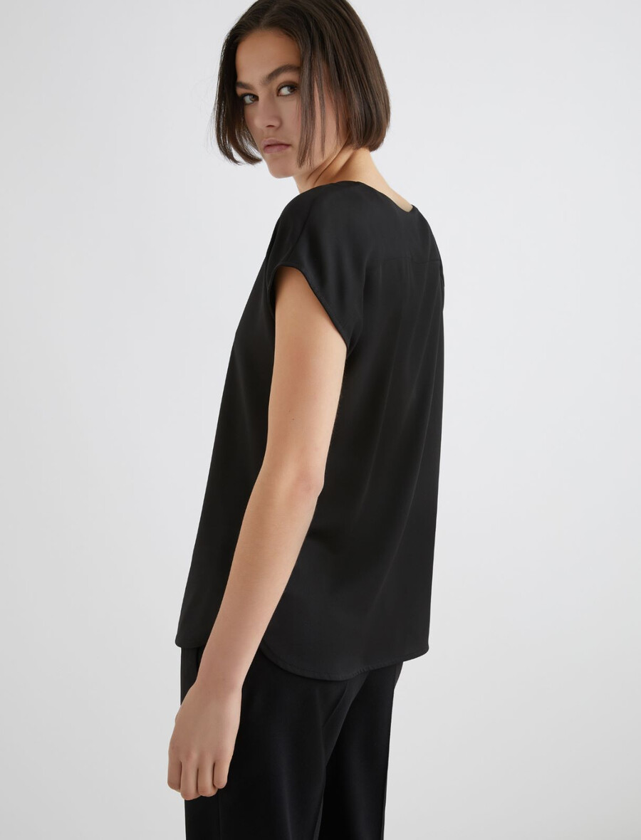 Minimalistična z drugačnim pridihom: ta satenasta bluza boža kožo in odbija svetlobo zaradi svojega subtilnega sijaja. Ponaša se s kimono rokavi in V-izrezom za presenetljivo vsestranskost.