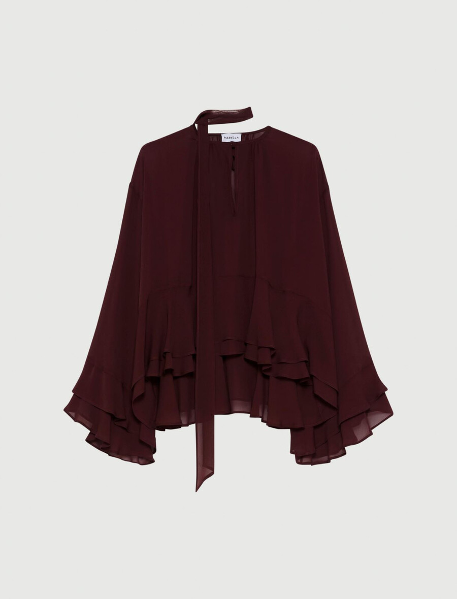 Ta bluza iz žoržeta izžareva eleganten šarm in jo je mogoče enostavno prilagoditi, zahvaljujoč zavezovalnemu traku na vratu. Dvojni volan na robu daje lahkotnost, zaradi česar je oblačilo popolno za kombiniranje z vsakodnevnimi kavbojkami ali bolj prefinjenim ujemajočim se krilom.