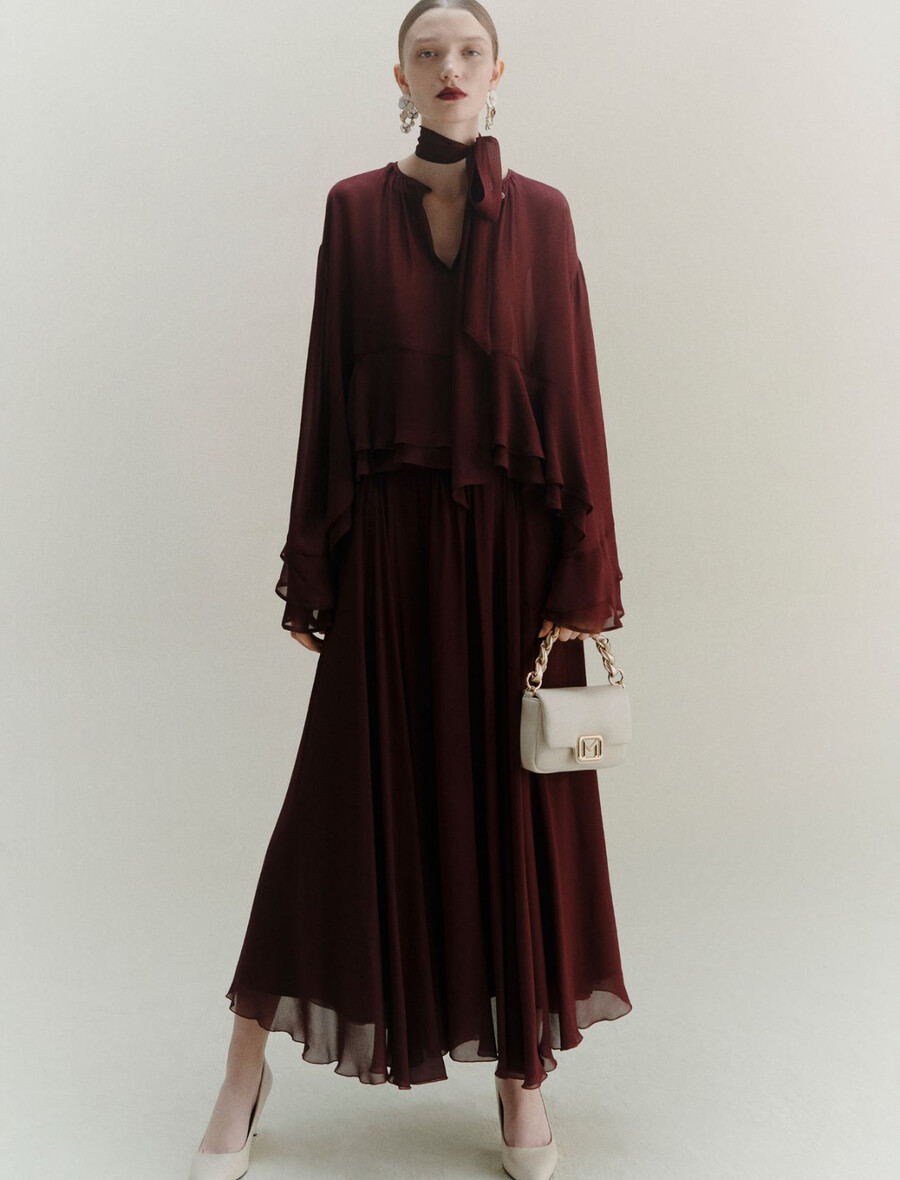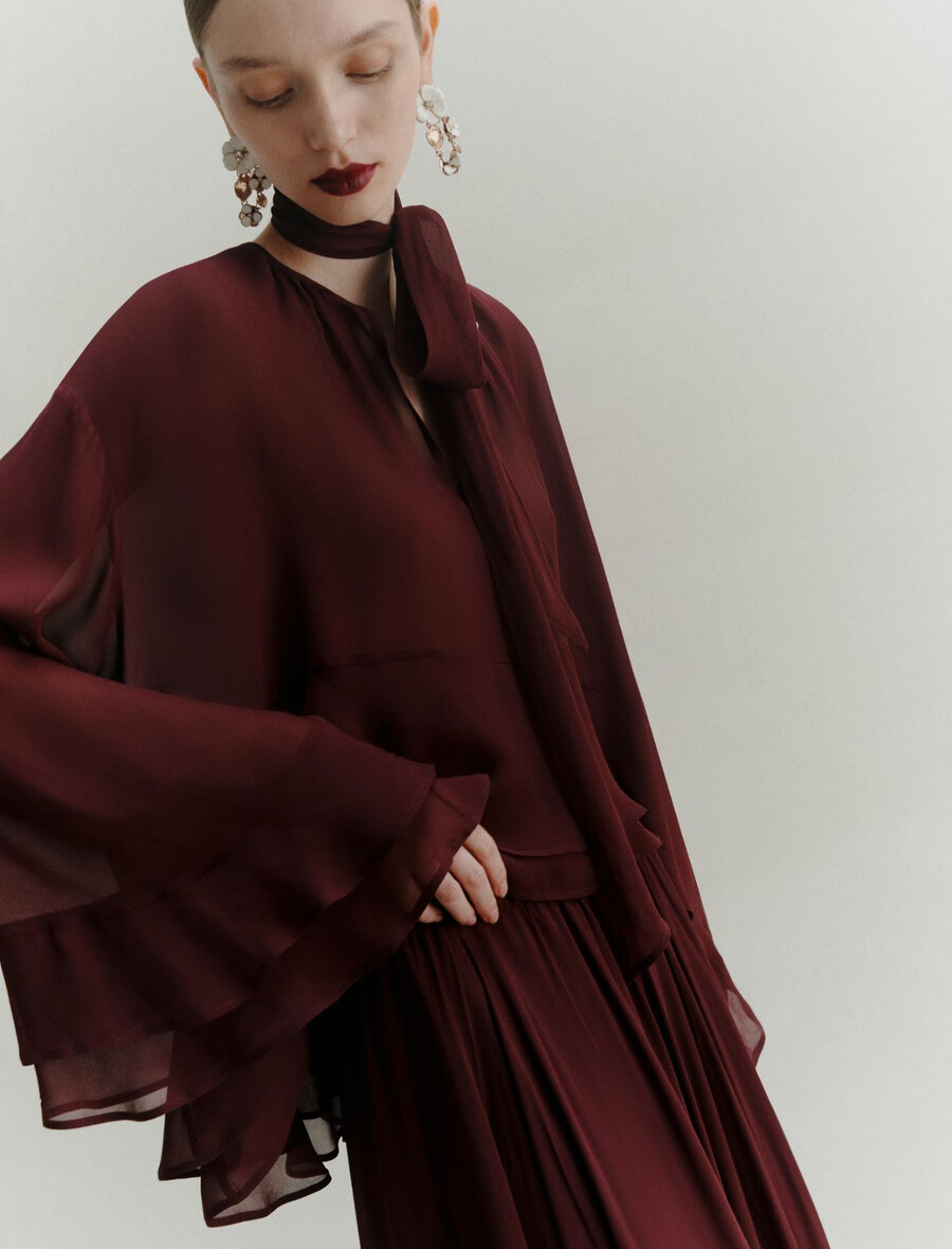 - Dolgi rokavi z dvojnimi volančki na manšetah in rahlo spuščenimi rameni