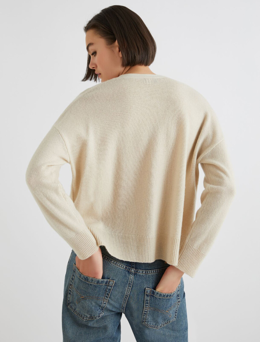 Ta novi kardigan oglatega kroja se odlikuje po sodobnem kroju in mehki volneno-kašmirski preji. Model se odlično poda k razširjenim kavbojkam in se dobro poda k potiskanim hlačam in oblekam, kar ustvari presenetljivo vsestranski končni rezultat.