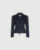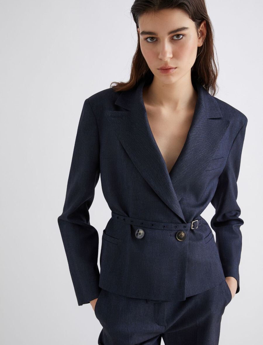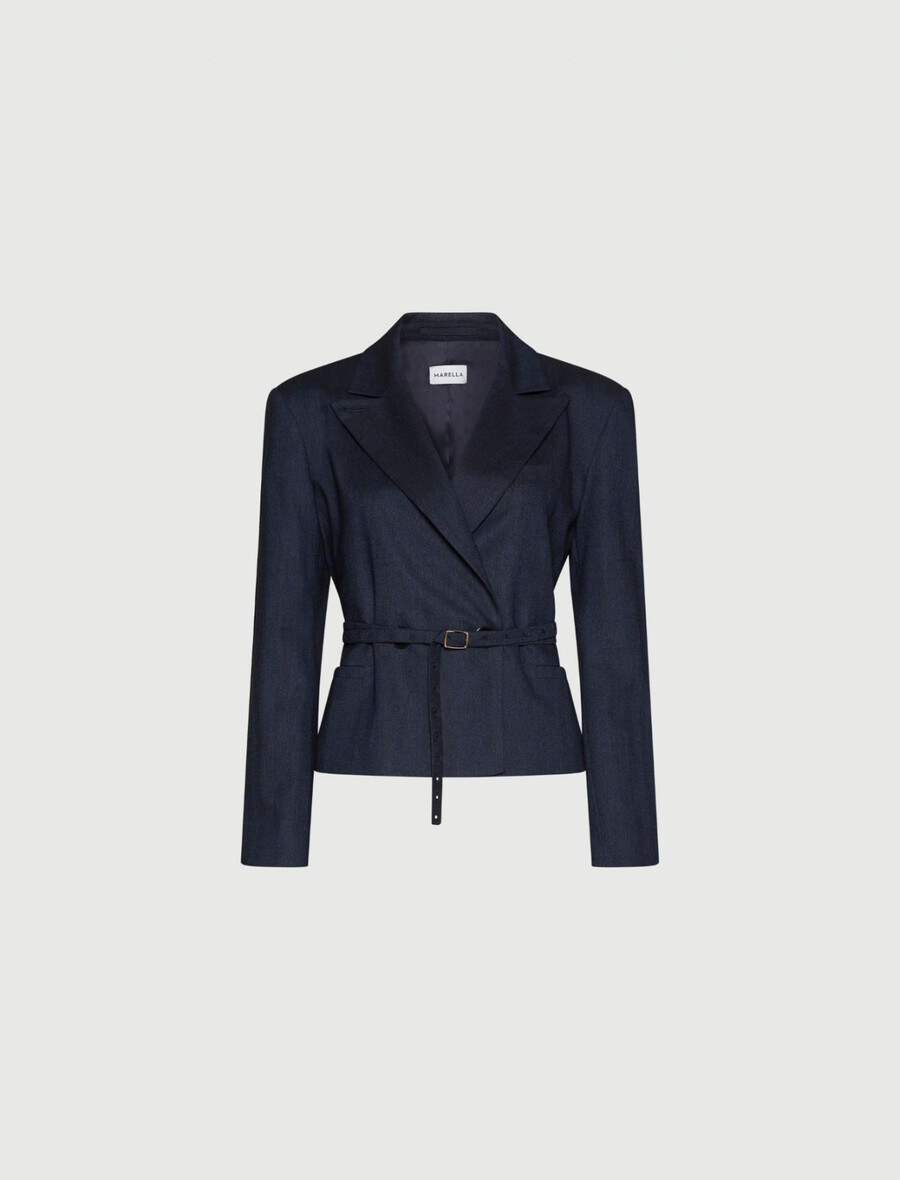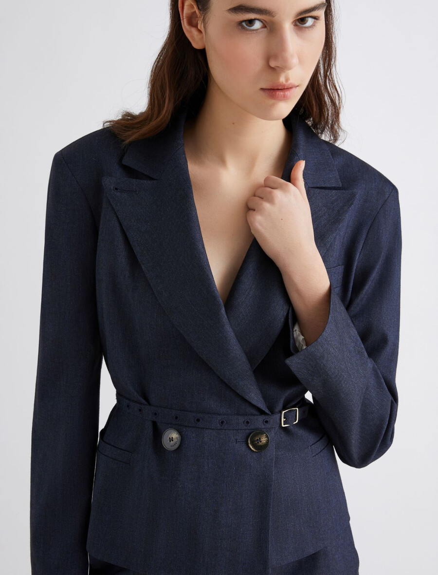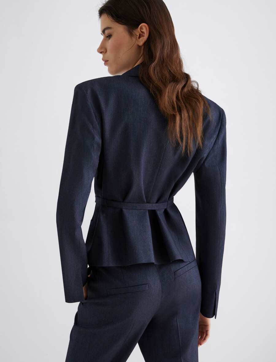 Nežen učinek džinsa spremeni to kratko jakno v pravi sezonski vsestranski kos: nosite jo s cigaretnimi hlačami in lahko bluzo za sodoben poslovni videz.