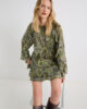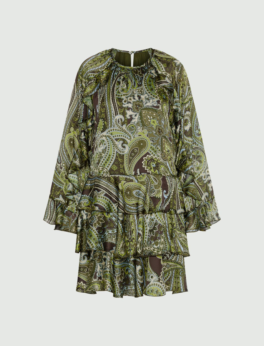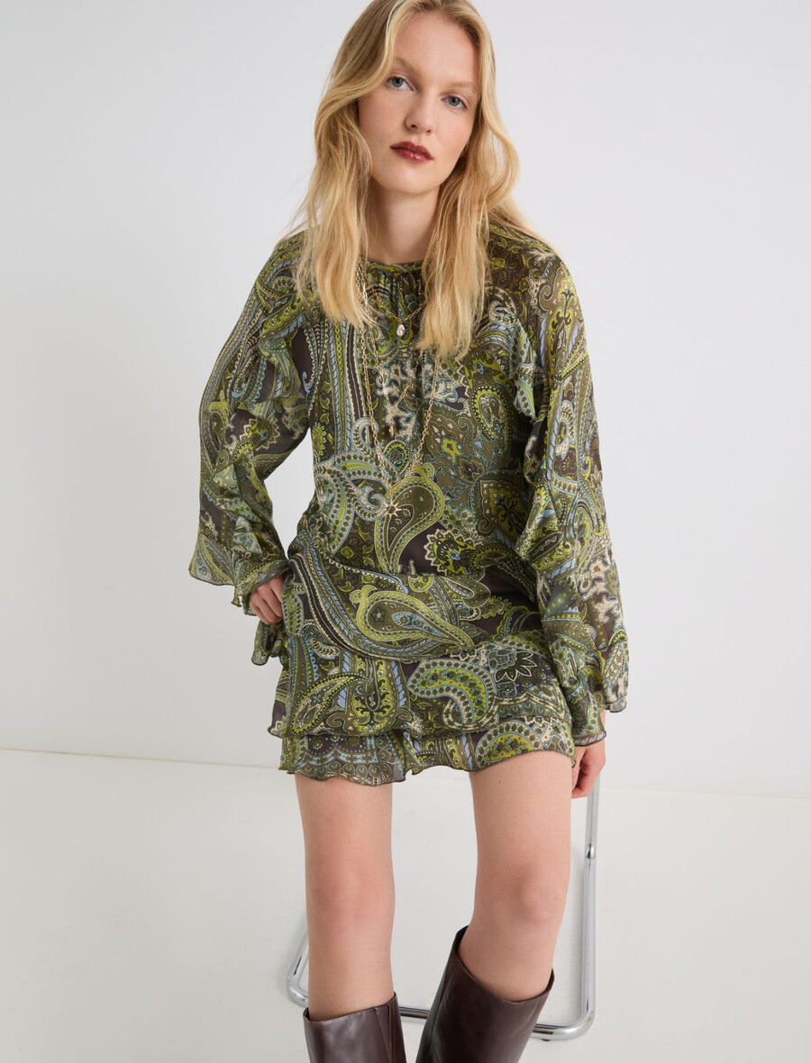 Popolna kombinacija s škornji in bleščečim nakitom: ta kratka obleka se ponaša z sproščenim krojem in romantičnimi volančki na krilu. Paisley vzorec doda pridih barve.