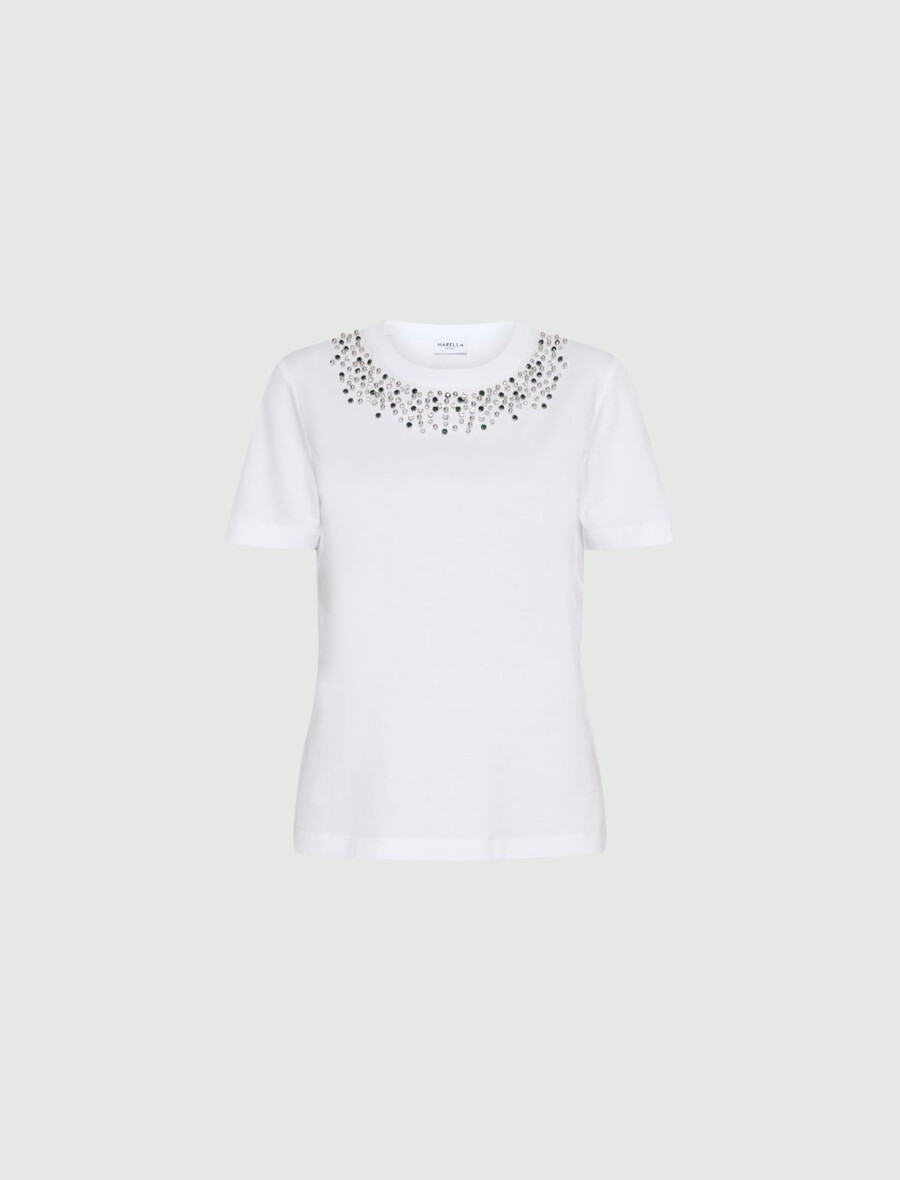 Osnovni dizajn majice s kratkimi rokavi pušča prostor za ultra glamurozne detajle: vezene kristale. Kombinirajte jo z najljubšimi kavbojkami ali pod suknjičem; to je resnično obvezen kos za tiste, ki radi bleščijo.
