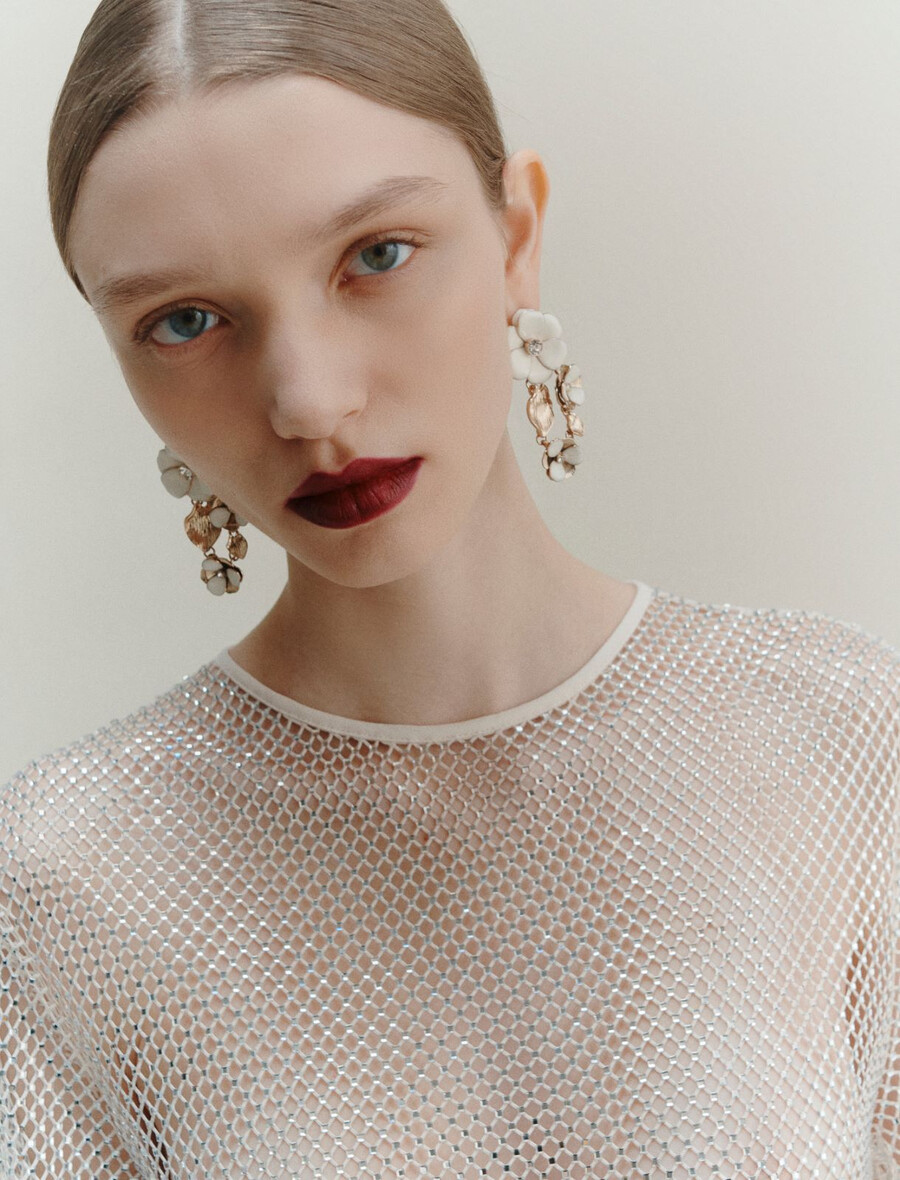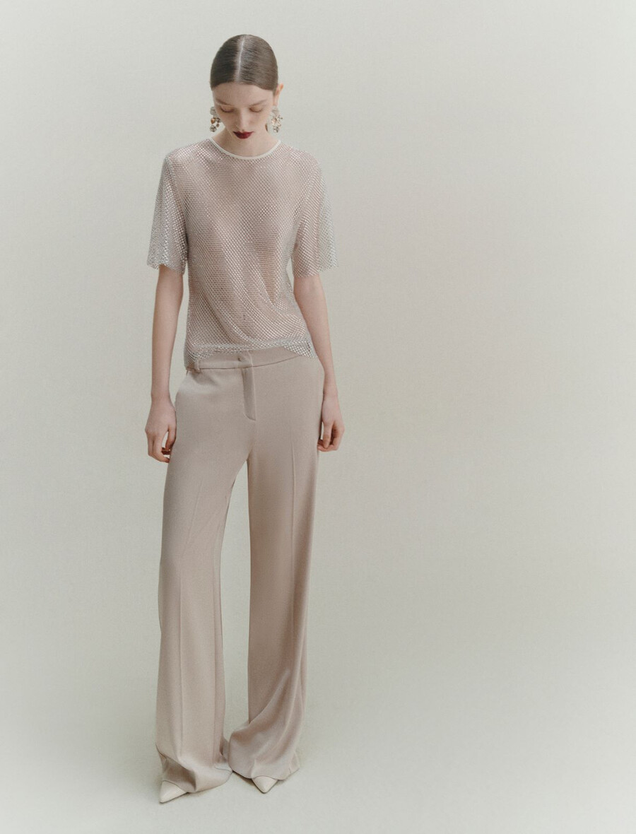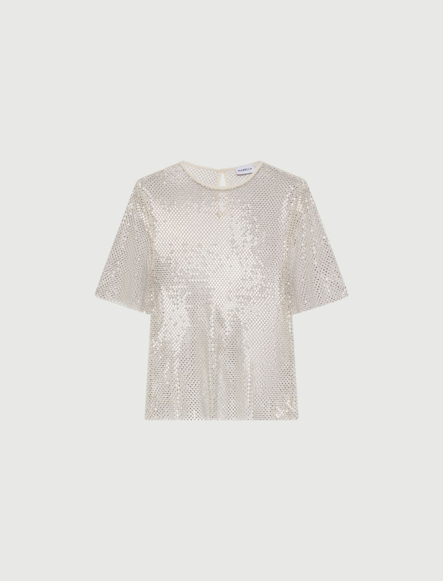 - Majica iz tehnične mrežaste tkanine, okrašena s kamenčki