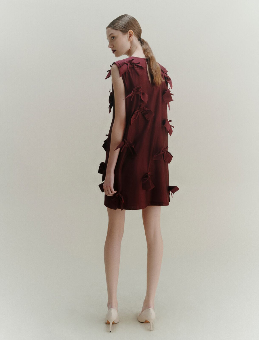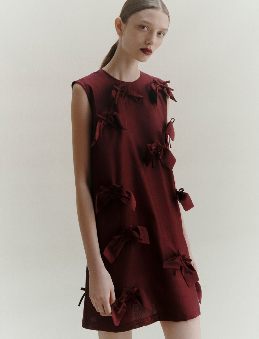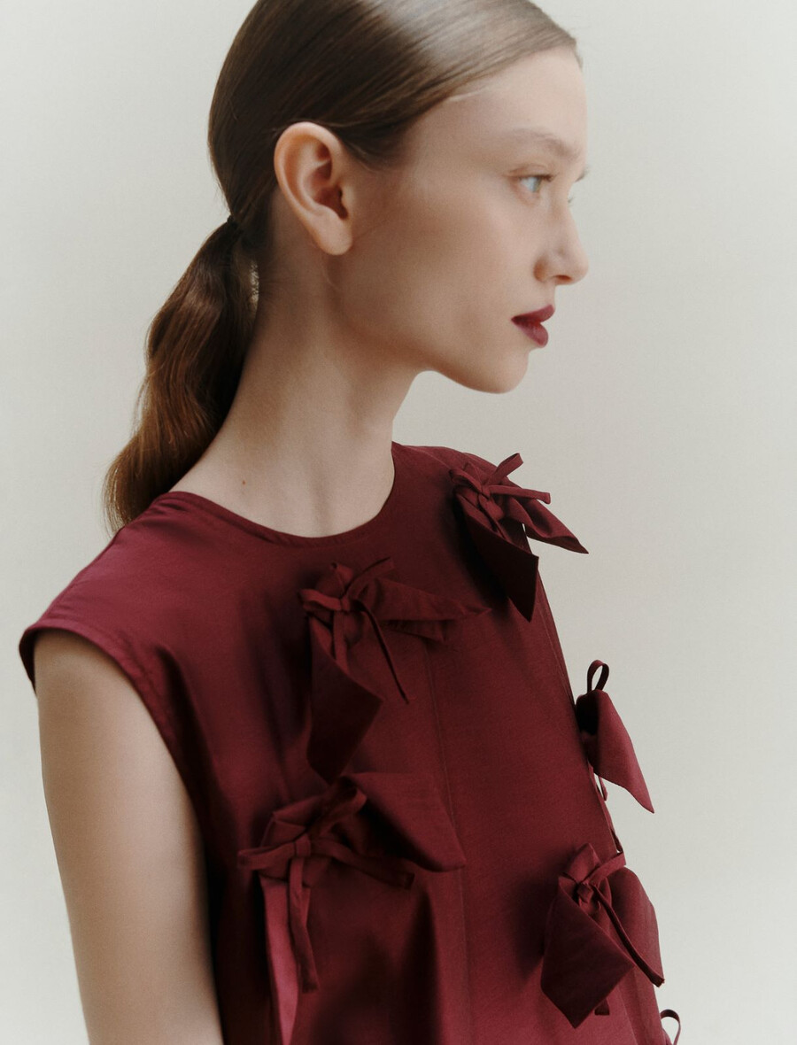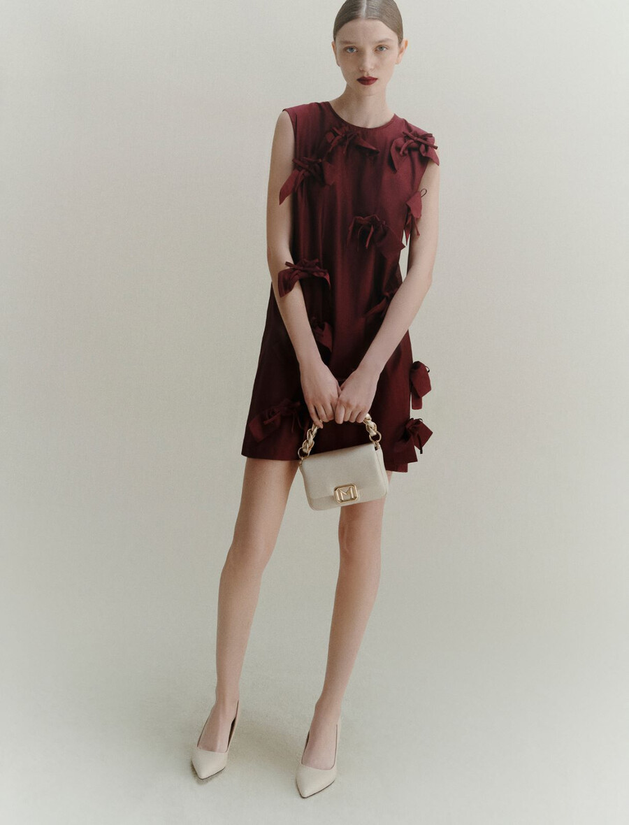 Ta obleka iz plapolajoče bombažne in svilene voile tkanine izžareva svežino in se poigrava z detajli pentlje. Osnovni kroj postavlja v nasprotje formalnost z romantiko.