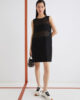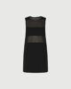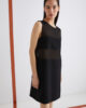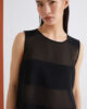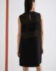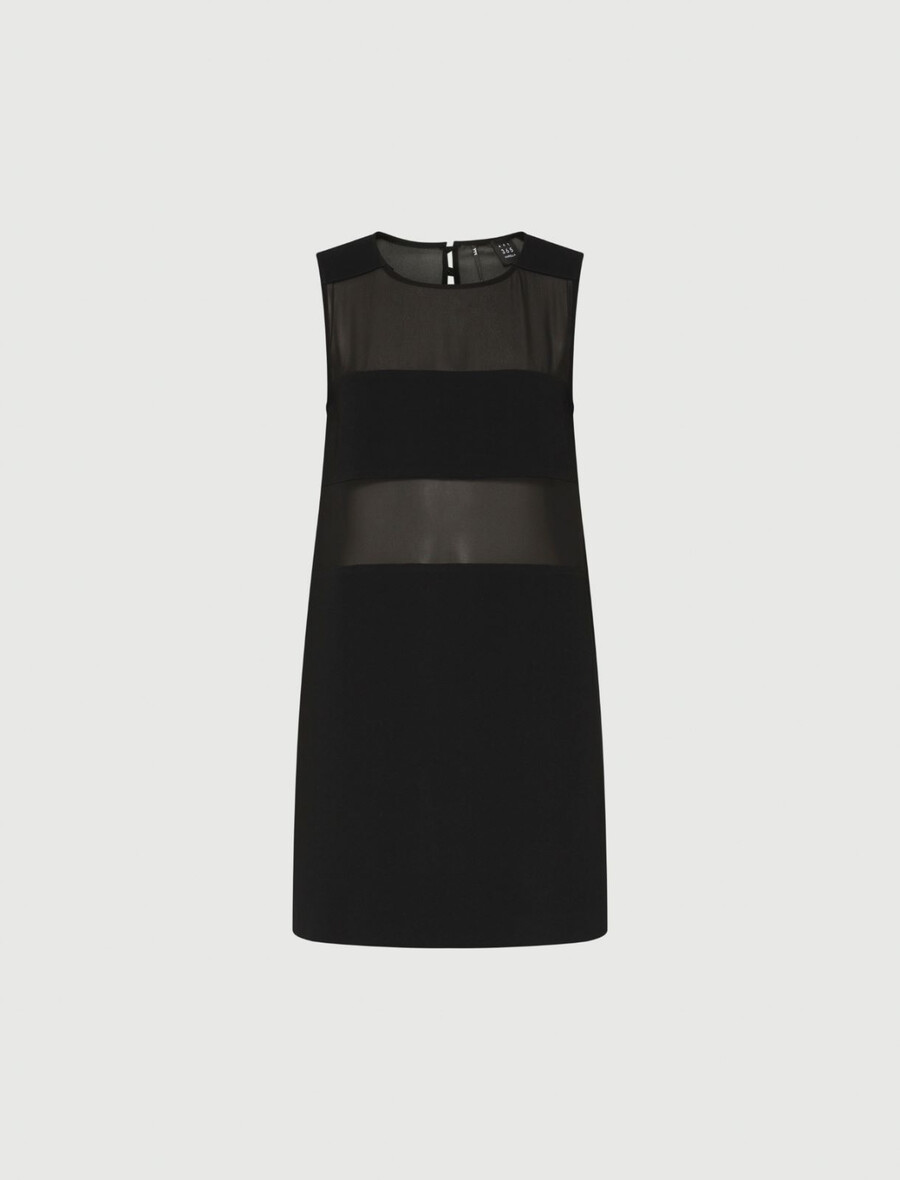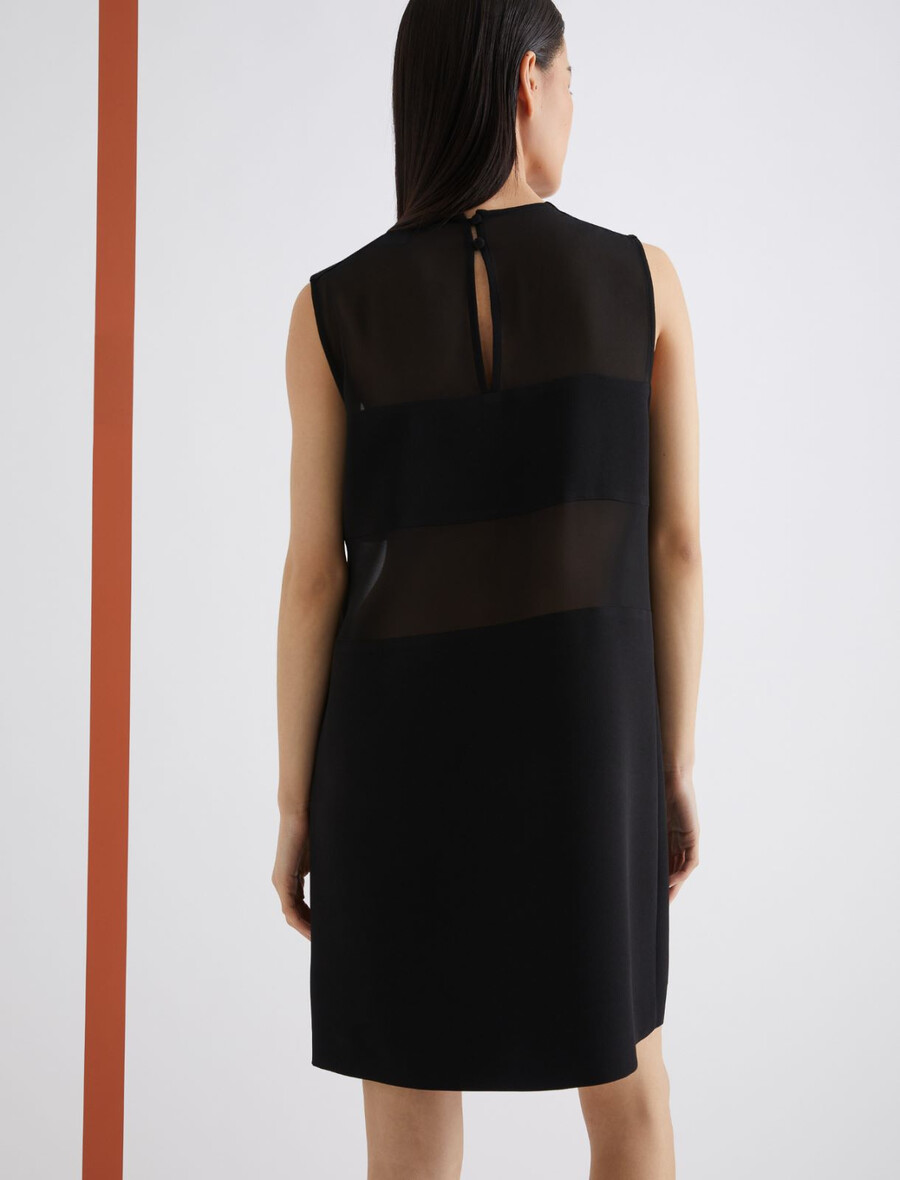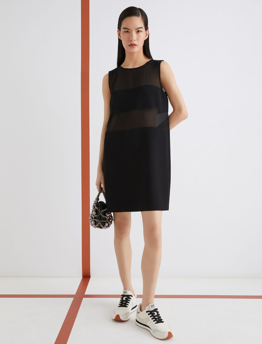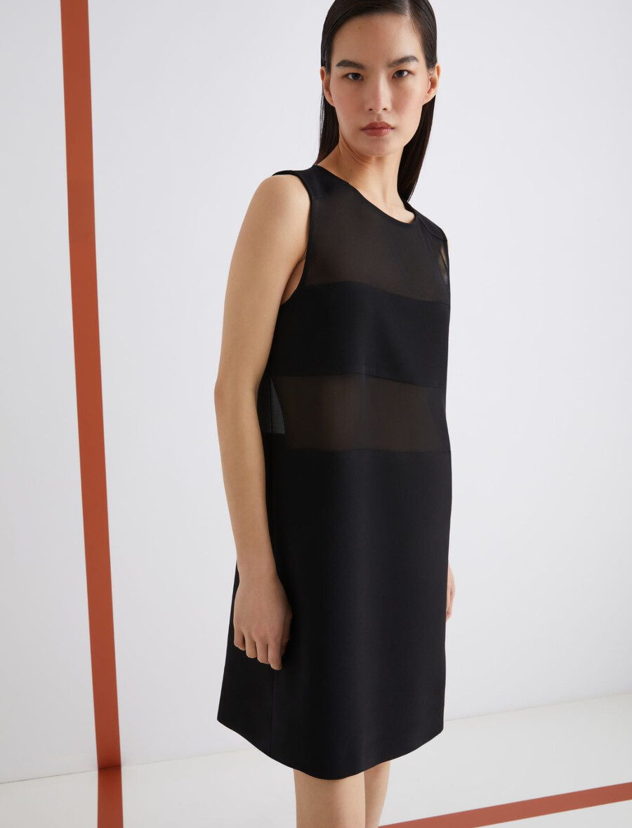 Bistveni kroj in prefinjeni materiali: ta nova satenasta obleka brez rokavov se ponaša z vodoravnimi paneli iz žoržeta, ki ustvarjajo čutne prosojne detajle na stezniku.
