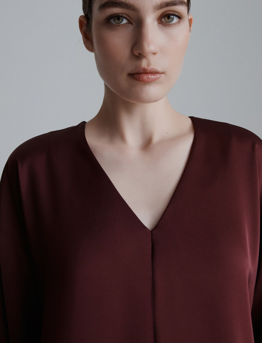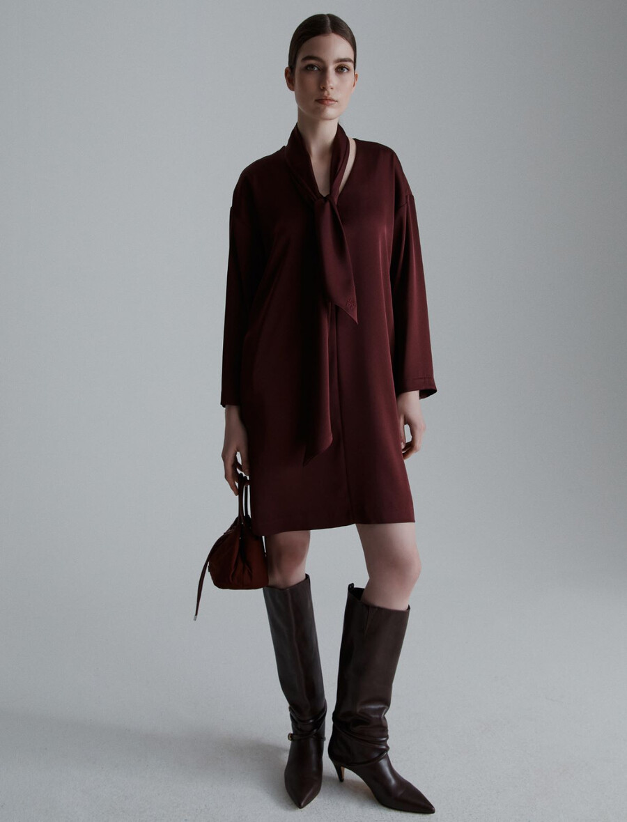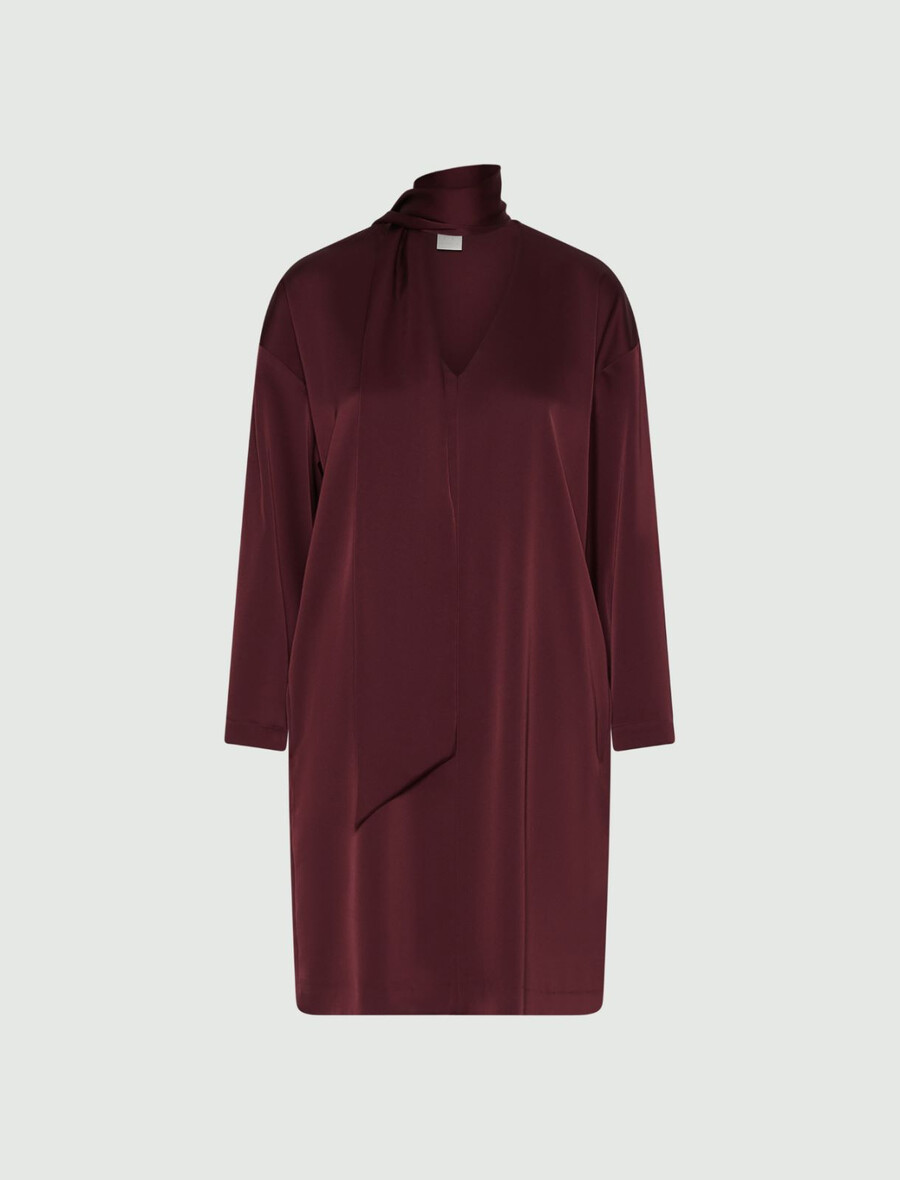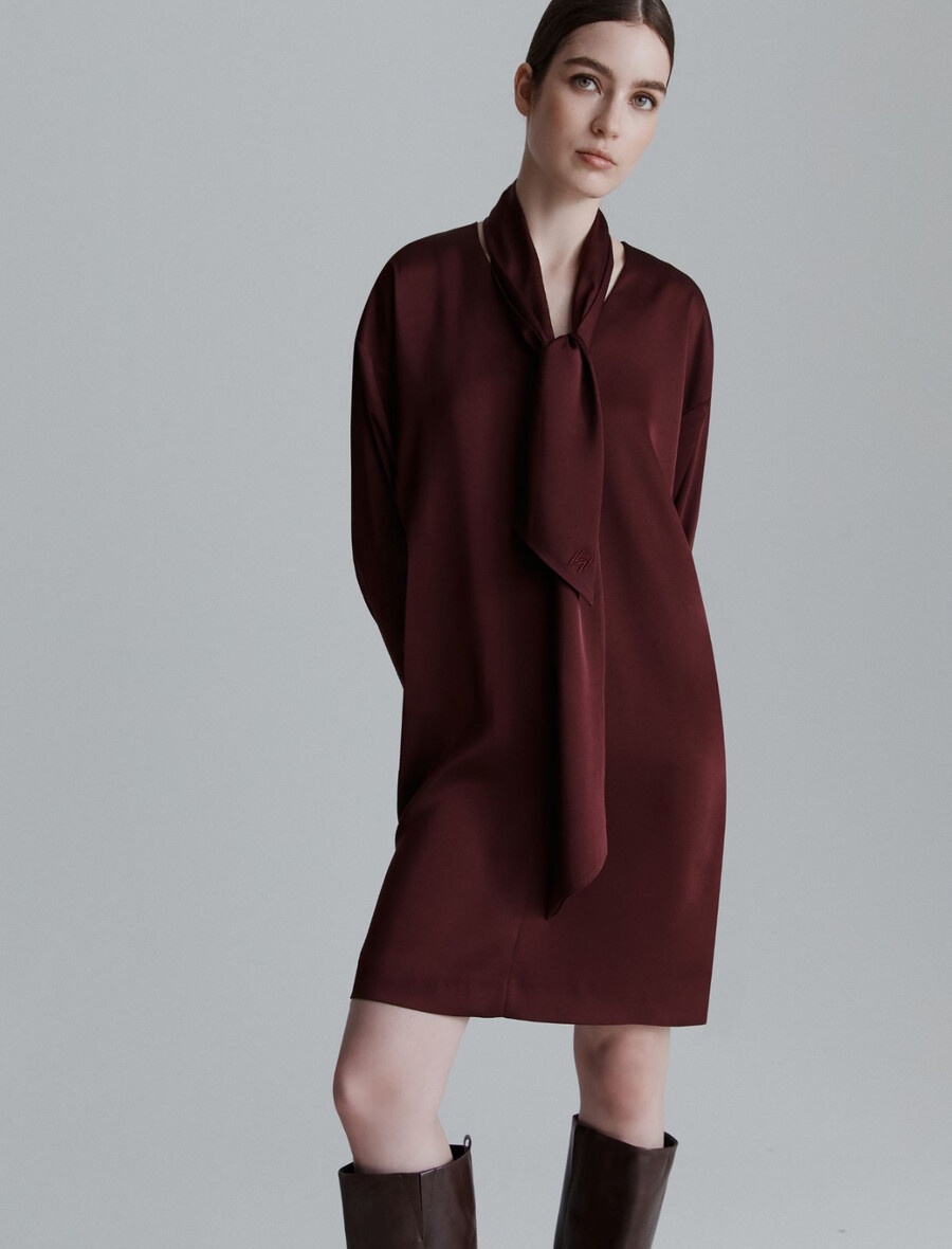 Ta sijoča satenasta obleka, ki oprijema postavo, združuje urbane pridihe z romantičnim pasom. Zapnite jo v pentljo okoli vratu ali pa jo pustite spustiti za učinek vezanja.