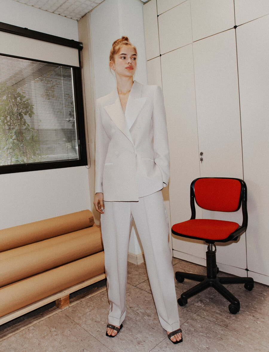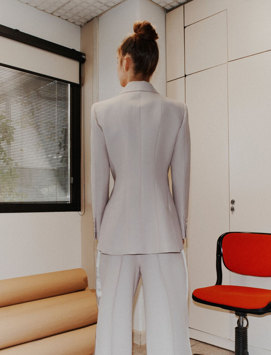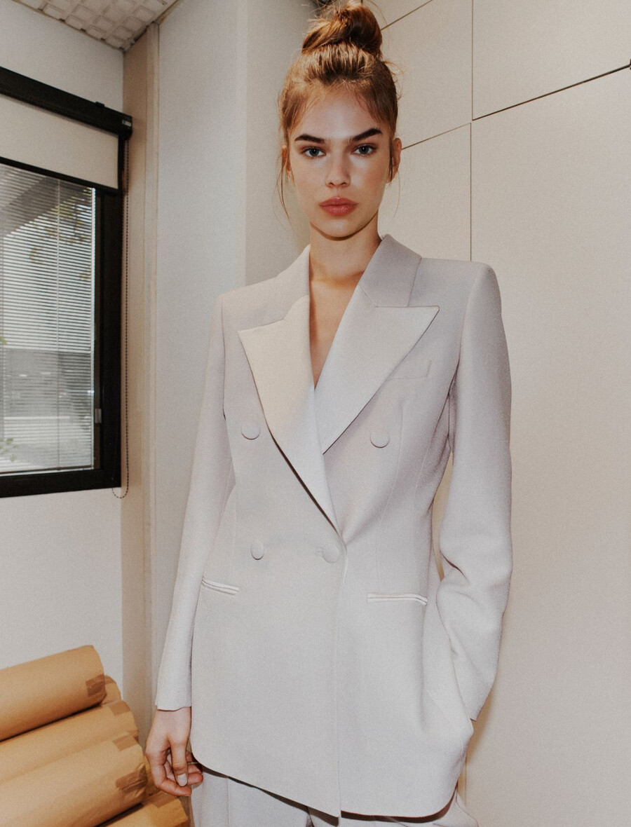 Moč gor! Metropolitanski slog je s tem novim modelom ozkega blazerja dobil novo energijo: drzen kroj in ženstvena silhueta se združujeta s krojaškimi linijami in tkaninami.