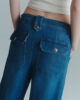 - Poševni stranski žepi in našiti zadnji žepi z detajlom iz kovinskega gumba z blagovno znamko.
