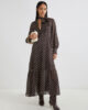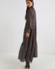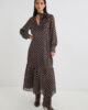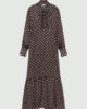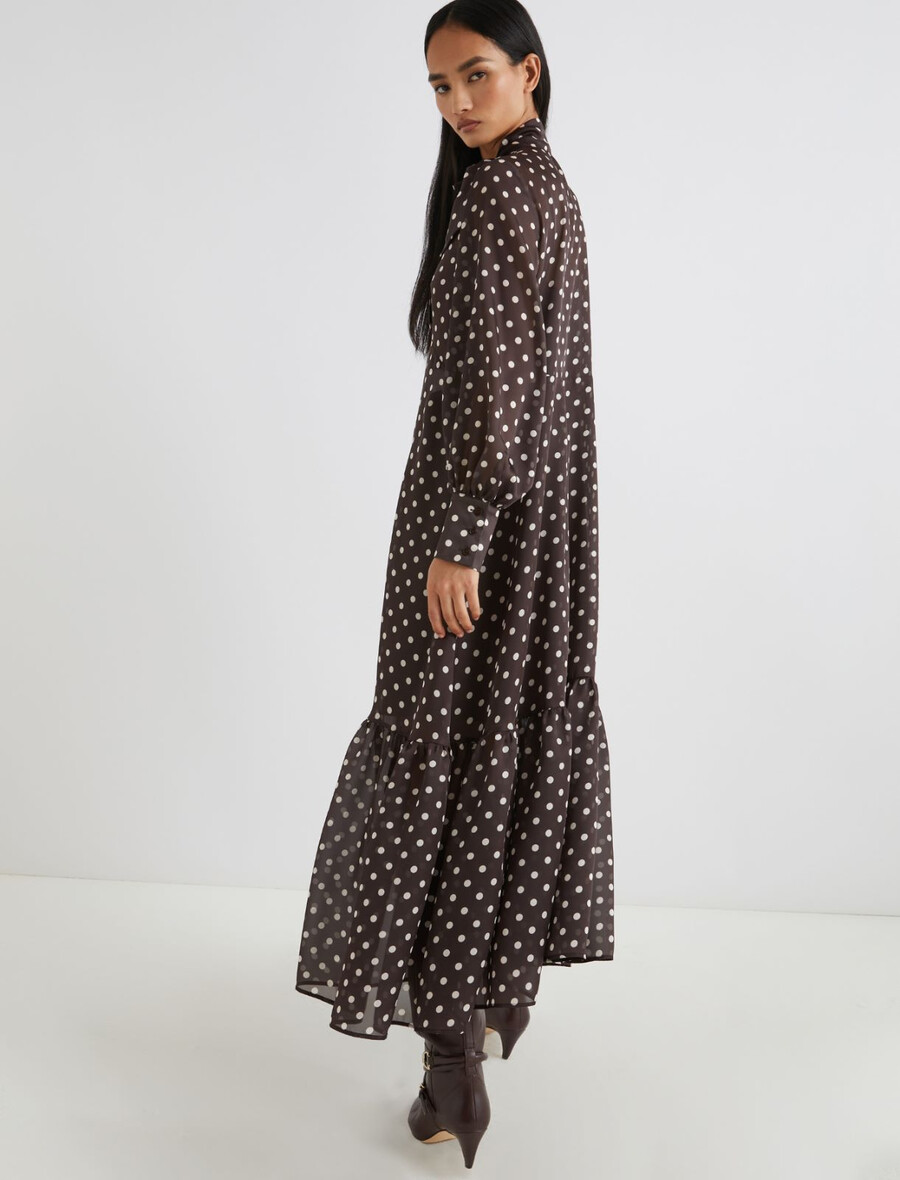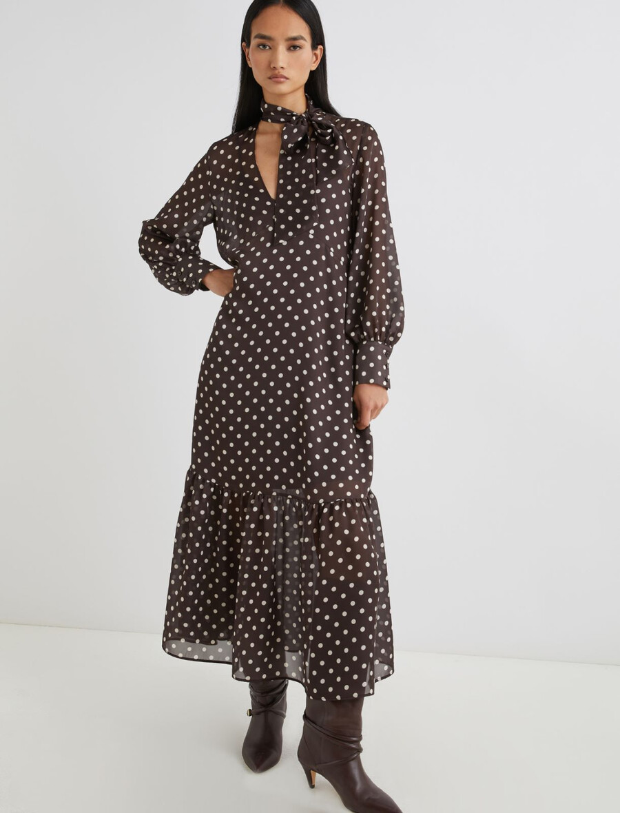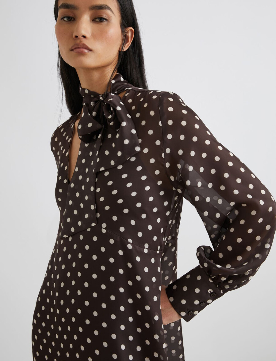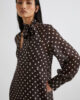 Elegantni pikčasti vzorci se srečajo z modernim modelom: novo šifonsko satenasto obleko z zavezujočo se ruto. Napihnjeni rokavi in volančki se poigravajo z najbolj romantičnimi vibracijami 80-ih.