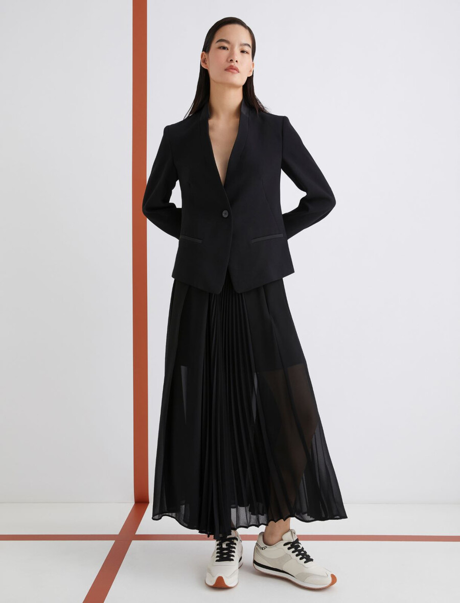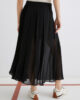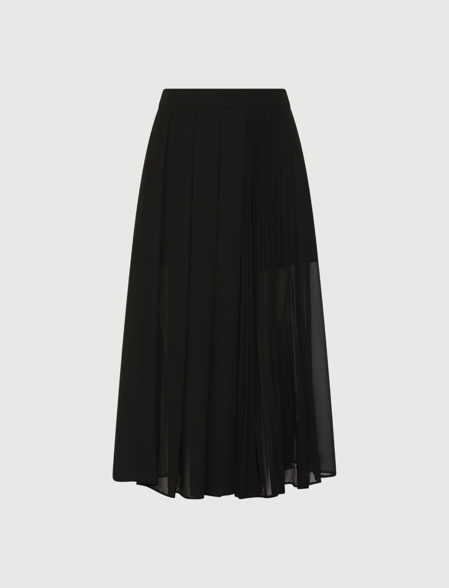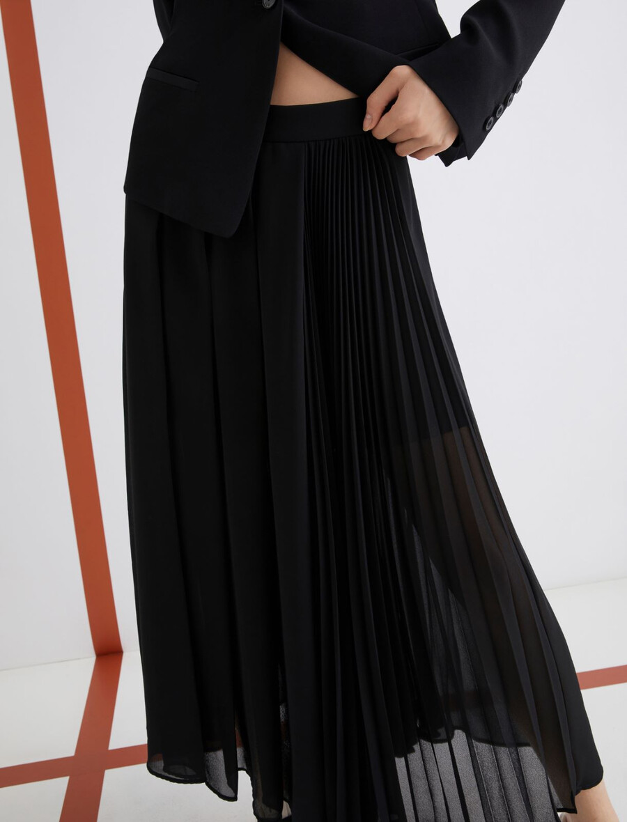 Z vsakim vašim korakom se razširi in vzpenja: to plisirano krilo združuje ultra prefinjen pleten vzorec s pridihom glamuroznega žoržeta. Ultra ženstven model se lahko kombinira s kratkimi topi ali krojenimi suknjiči.