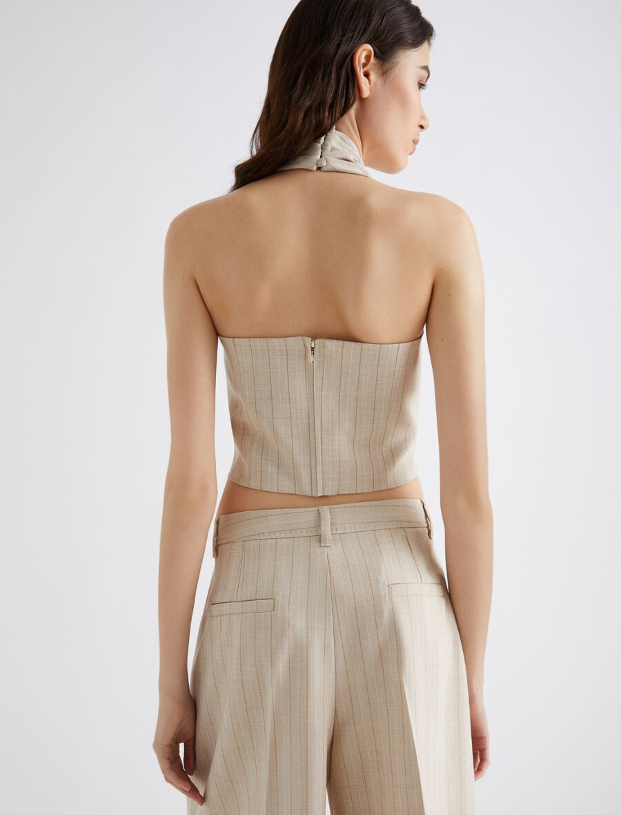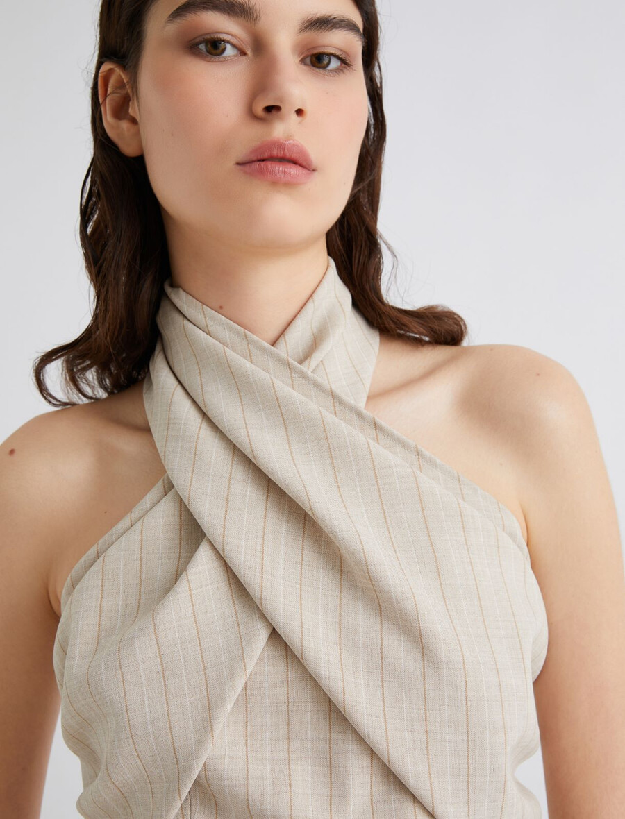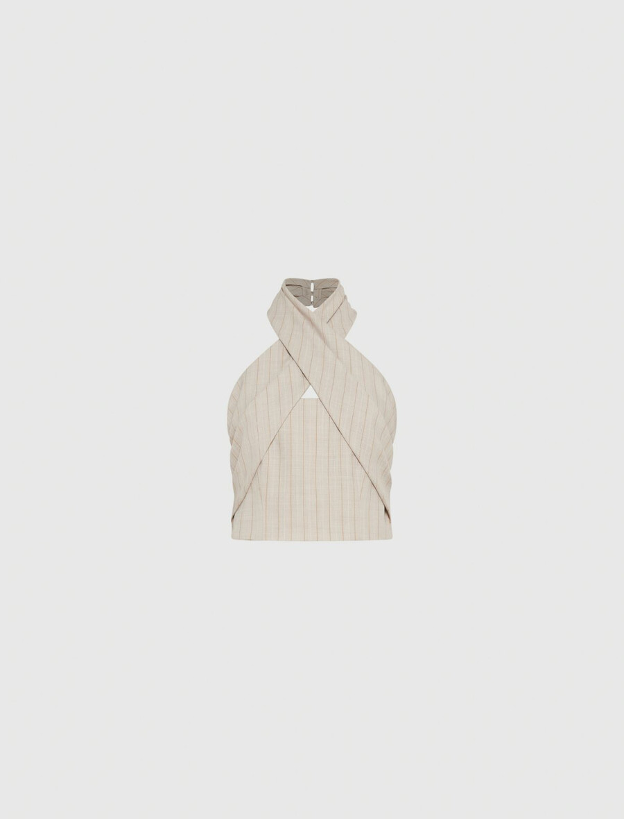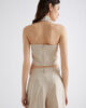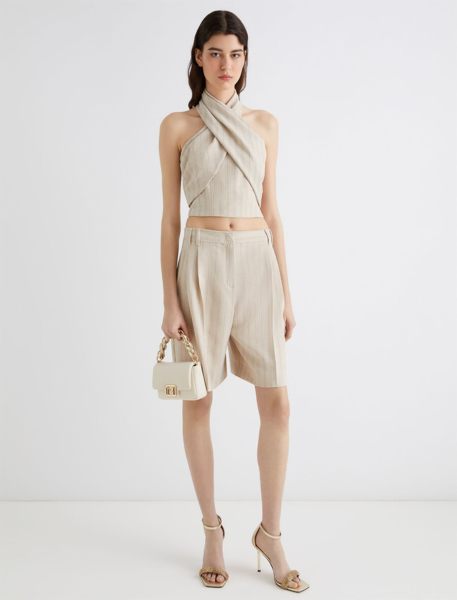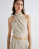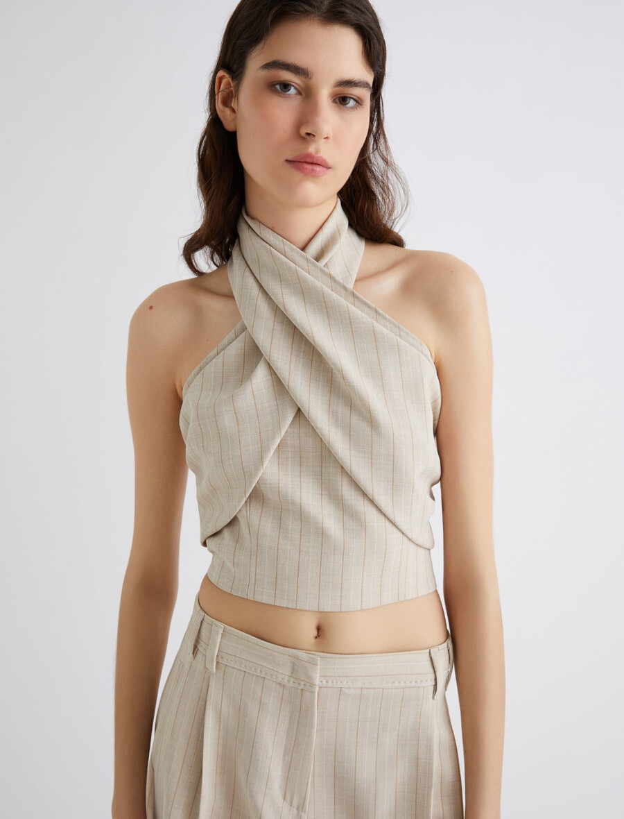 Novi ikonični top sezone se ponaša s skrajšanim krojem, dizajnom z odkritimi rameni in čutnim prekrižanim detajlom na sprednji strani. Urbana eleganca in čutnost se odlično združujeta.