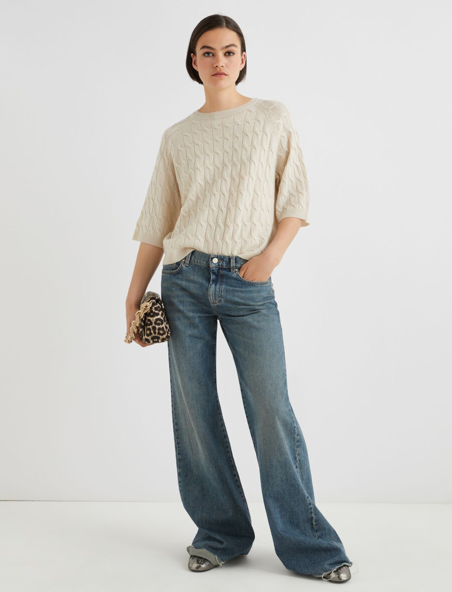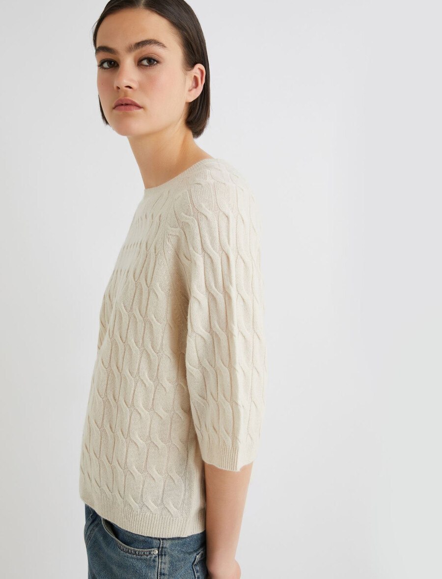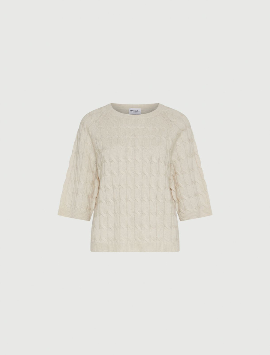 Mehka volnena in kašmirska tkanina doda temu puloverju sodobnega kroja pridih prefinjenosti. Zaradi pletenega vzorca in rokavov do komolcev je to lahkoten in eleganten kos za vsakodnevno nošenje.