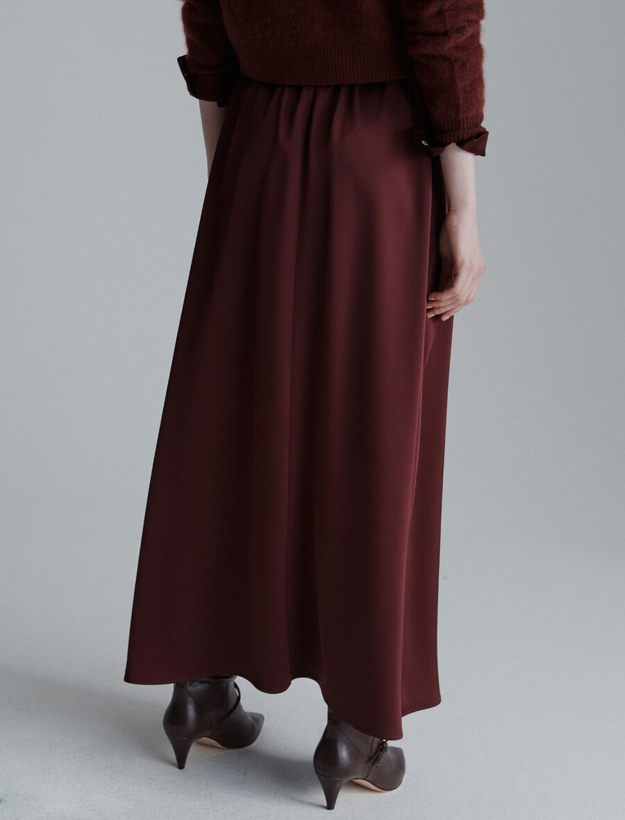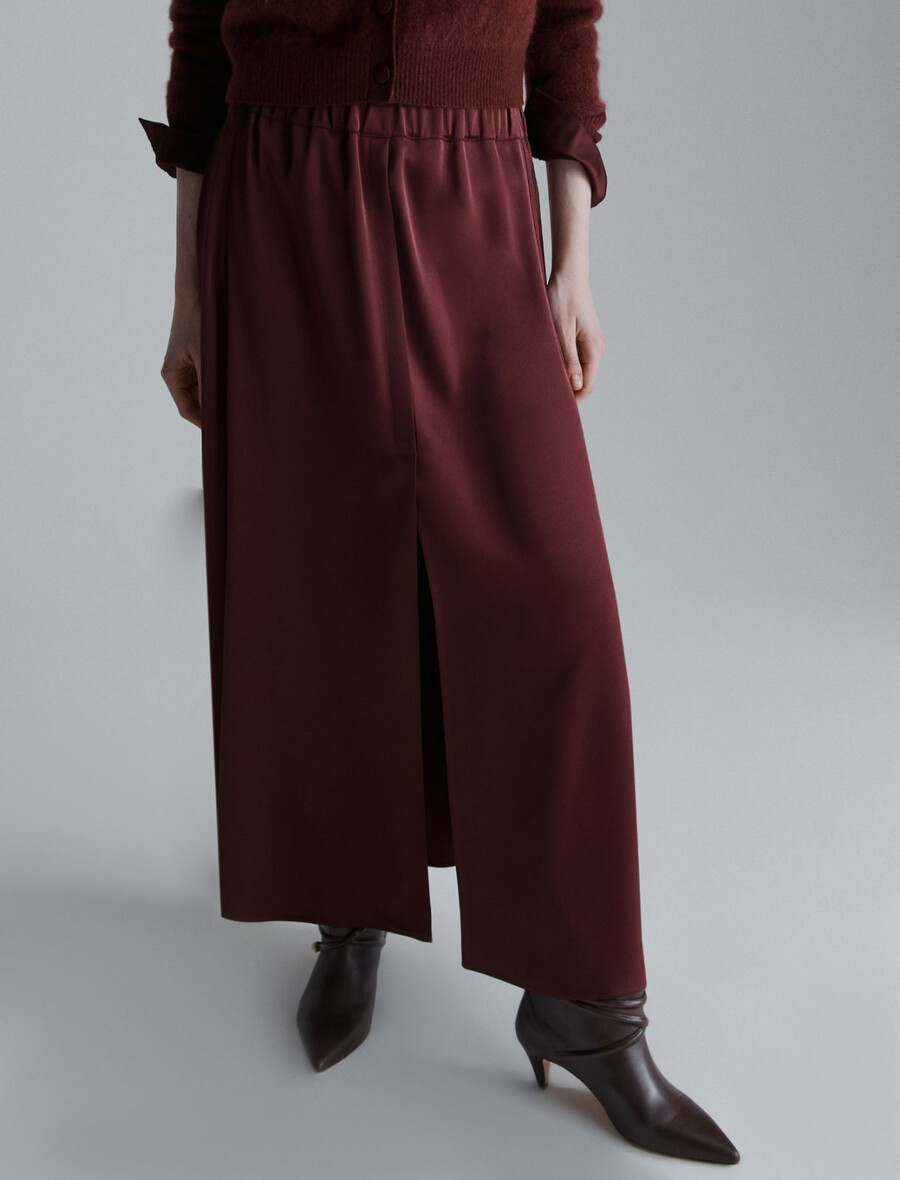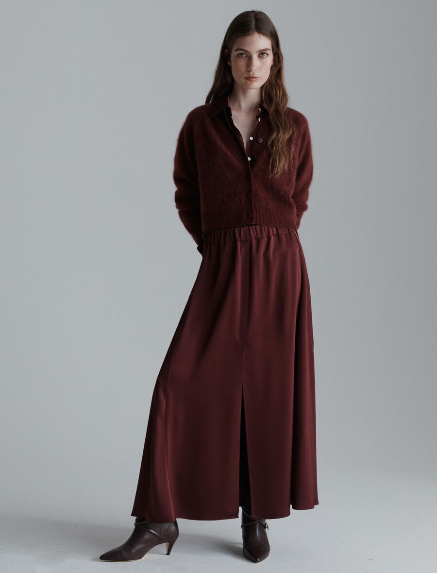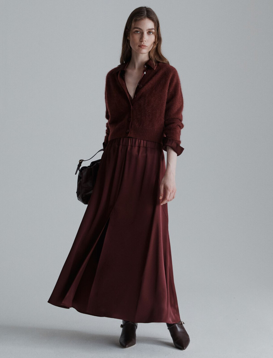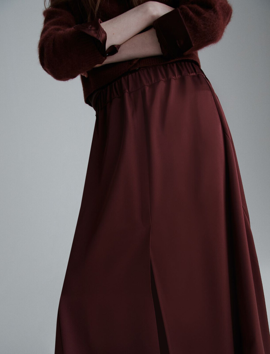Tekoča in valovita satenasta tkanina doda temu razširjenemu krilu do meč prefinjen pridih. Popolno za pisarno, večere ali srečanja s prijatelji.