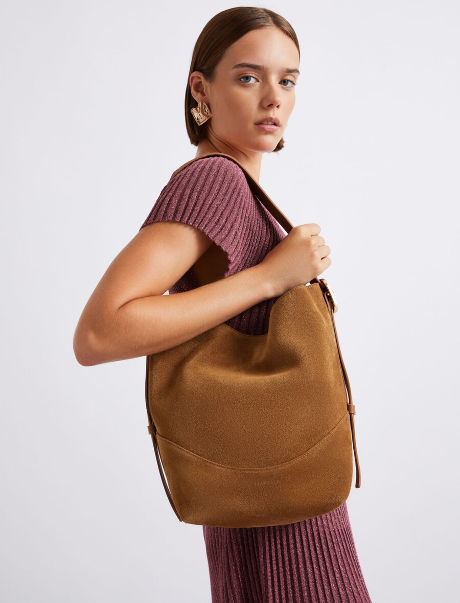 Mehka različica trendovske “it-shape” oblike: nova semiš torba hobo z zlatimi stranskimi zaponkami, ki poljubno podaljšajo naramnico. Preprosta elegancija par excellence.