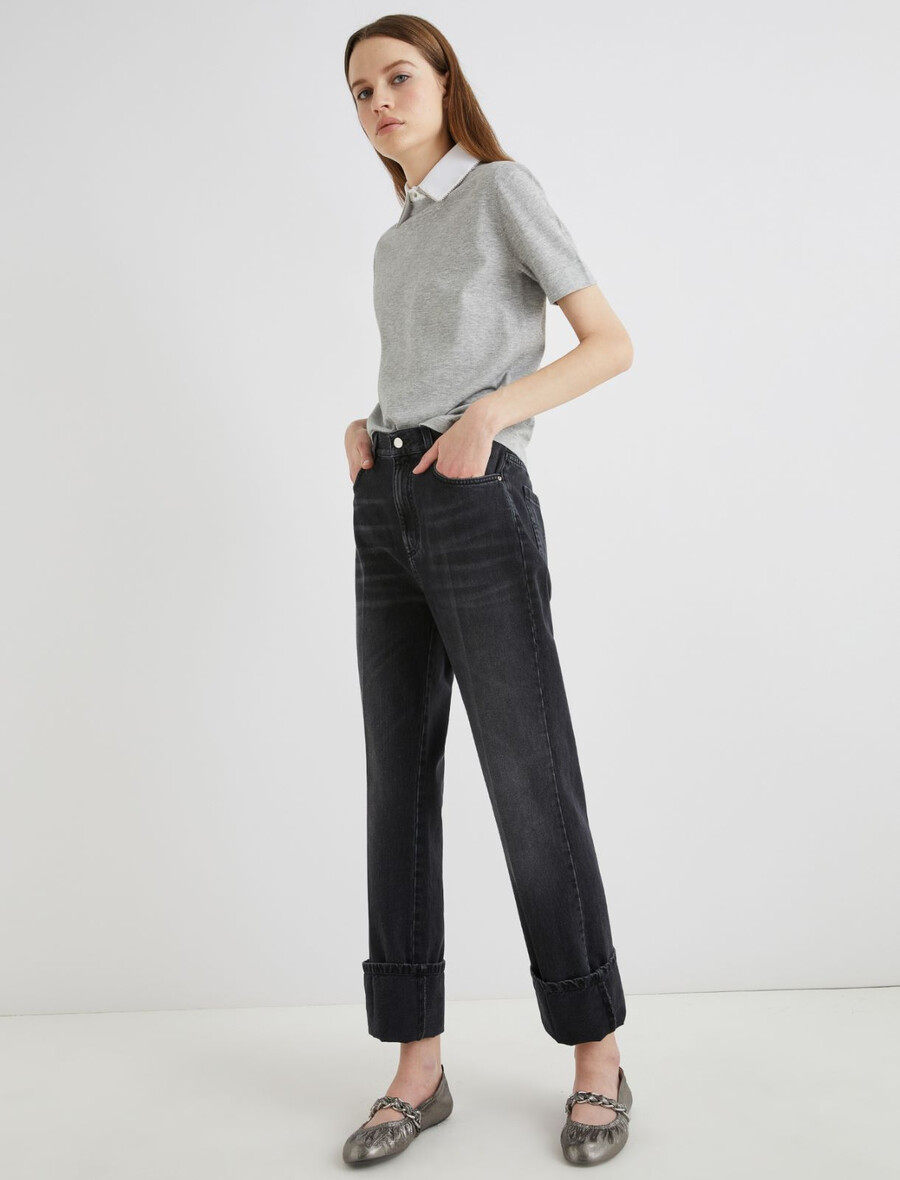 Revolucionarni DNK in vsakdanje prefinjenosti: nove široke kavbojke z globokim robom do gležnjev za še vitkejšo silhueto. Nosite jih vedno znova s svilenimi bluzami, suknjiči ali aktivnimi bomber jaknami.