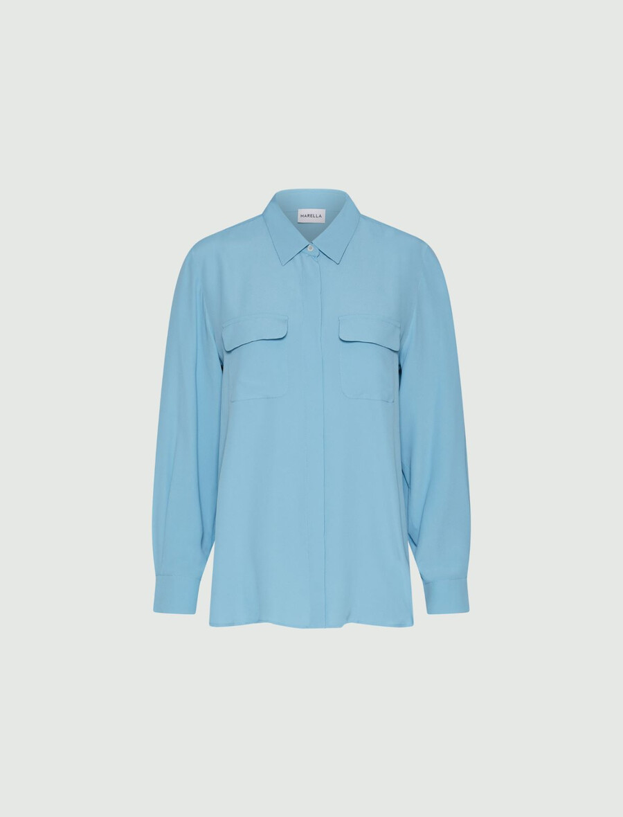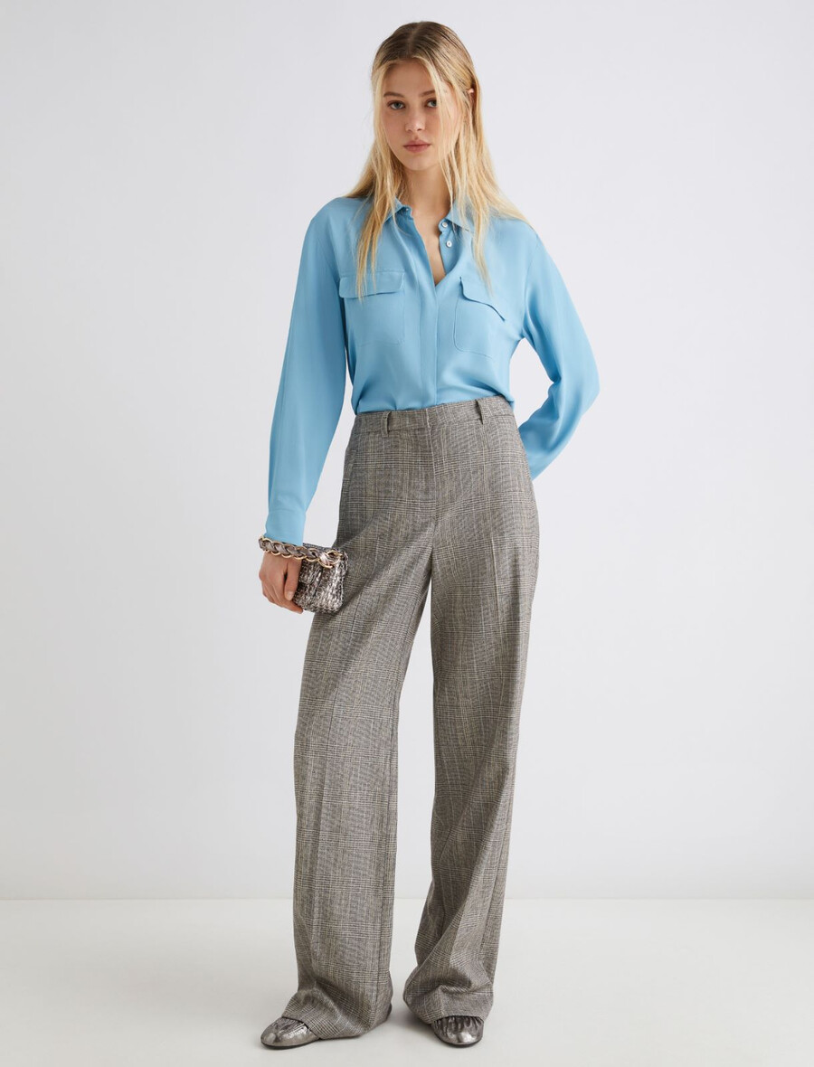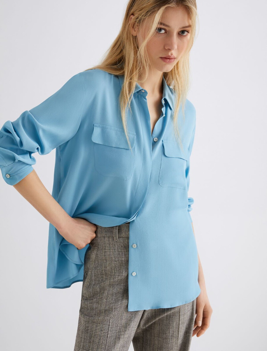 Moško vsestranska, a elegantno prefinjena: ta nova srajca iz mešanice svile se ponaša z navadnim zgornjim delom in dvojnim našitim žepom na prsih. Popolna je s krojenimi hlačami, kavbojkami ali padajočimi krili iz kolekcije.