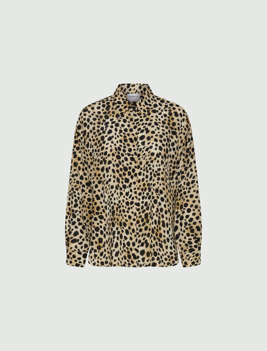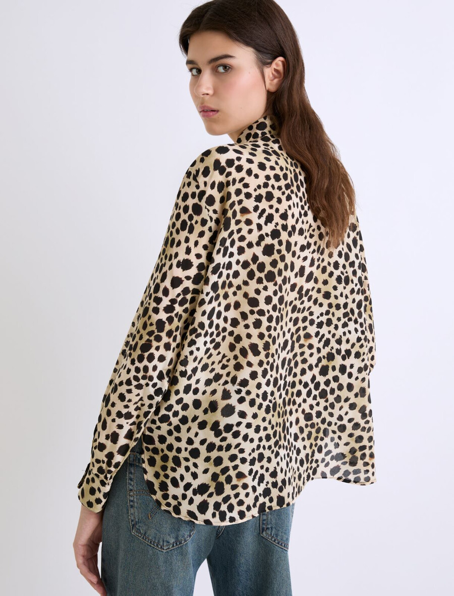 Ta hrapava in ultra glamurozna svilena srajca se ponaša z živalskim vzorcem, ki na svež način interpretira nov metropolitanski slog. Naj bo še bolj moderna s kavbojkami in plaščem iz dvojnega blaga sproščenega kroja.