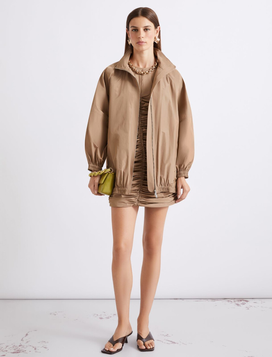Glamurozna različica kratke parke, izdelane iz tehnične taftaste tkanine za sproščujoče razpoloženje. Oblecite jo s kratkimi hlačami, sandali in bleščečim nakitom, da se elegantno spopadete z vsemi nevihtami, ki vam pridejo na pot.