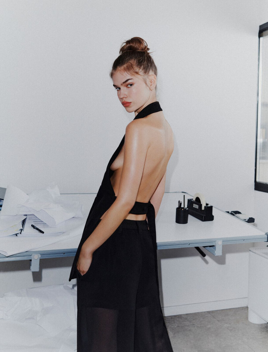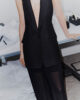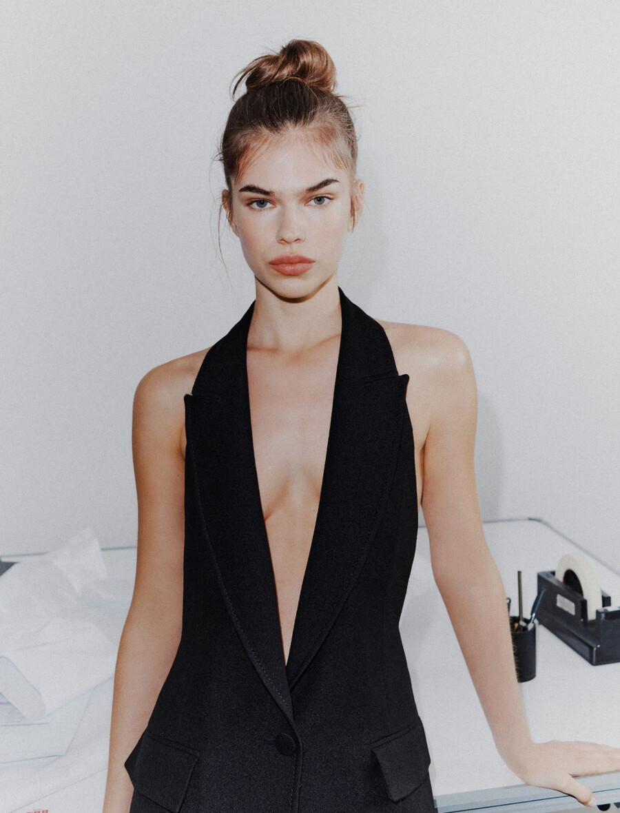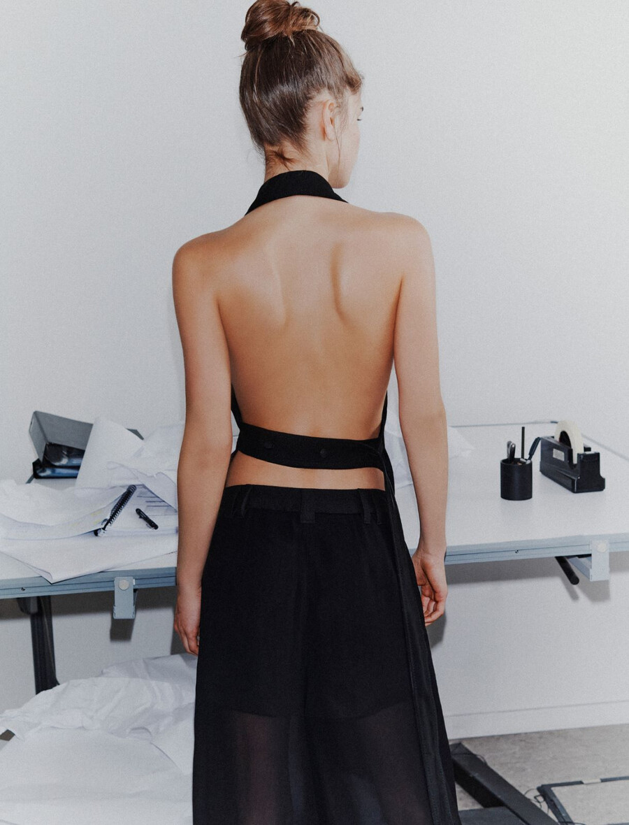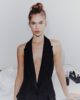 Eleganten kot suknjič in čuten kot zgornji del: predstavljamo najbolj vsestranski model za vaše posebne priložnosti. Globoki reverji delujejo kot izrez, ko kos nosite kot zgornji del.