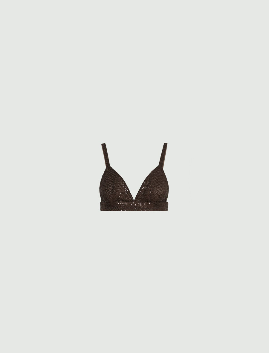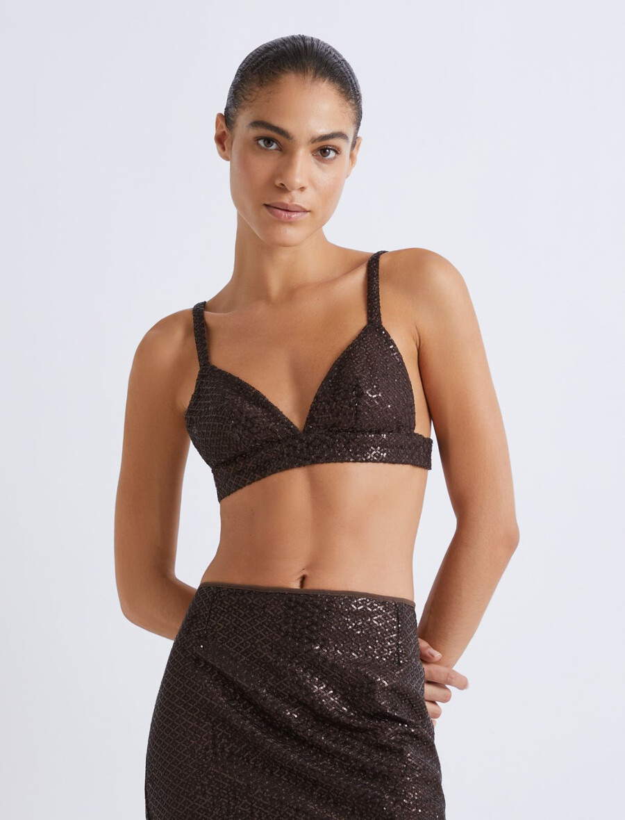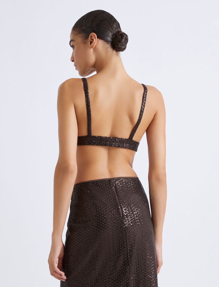 Minimalističen, bleščeč in izrazito seksi: ta top iz tila z bleščicami pritegne pozornost na golo kožo z igro izstopajočih izrezov in poudarjenih izrezov. Za večerni videz, ki bo pritegnil poglede, ga kombinirajte z ujemajočim se krilom do meč.