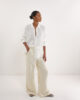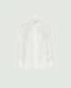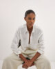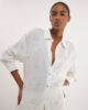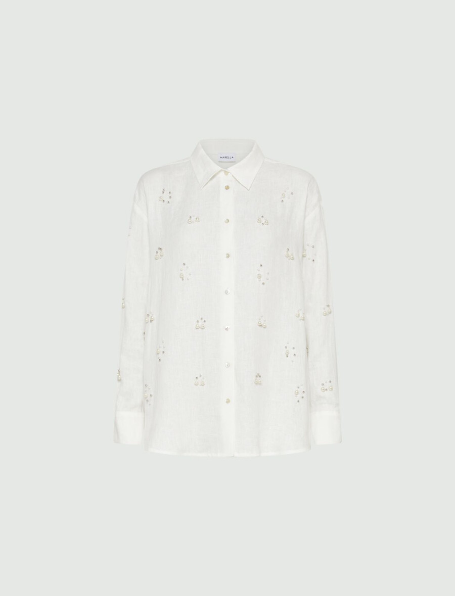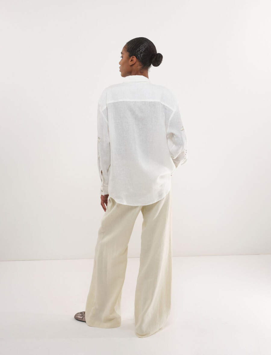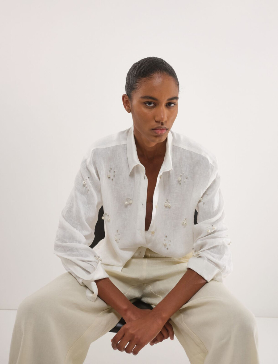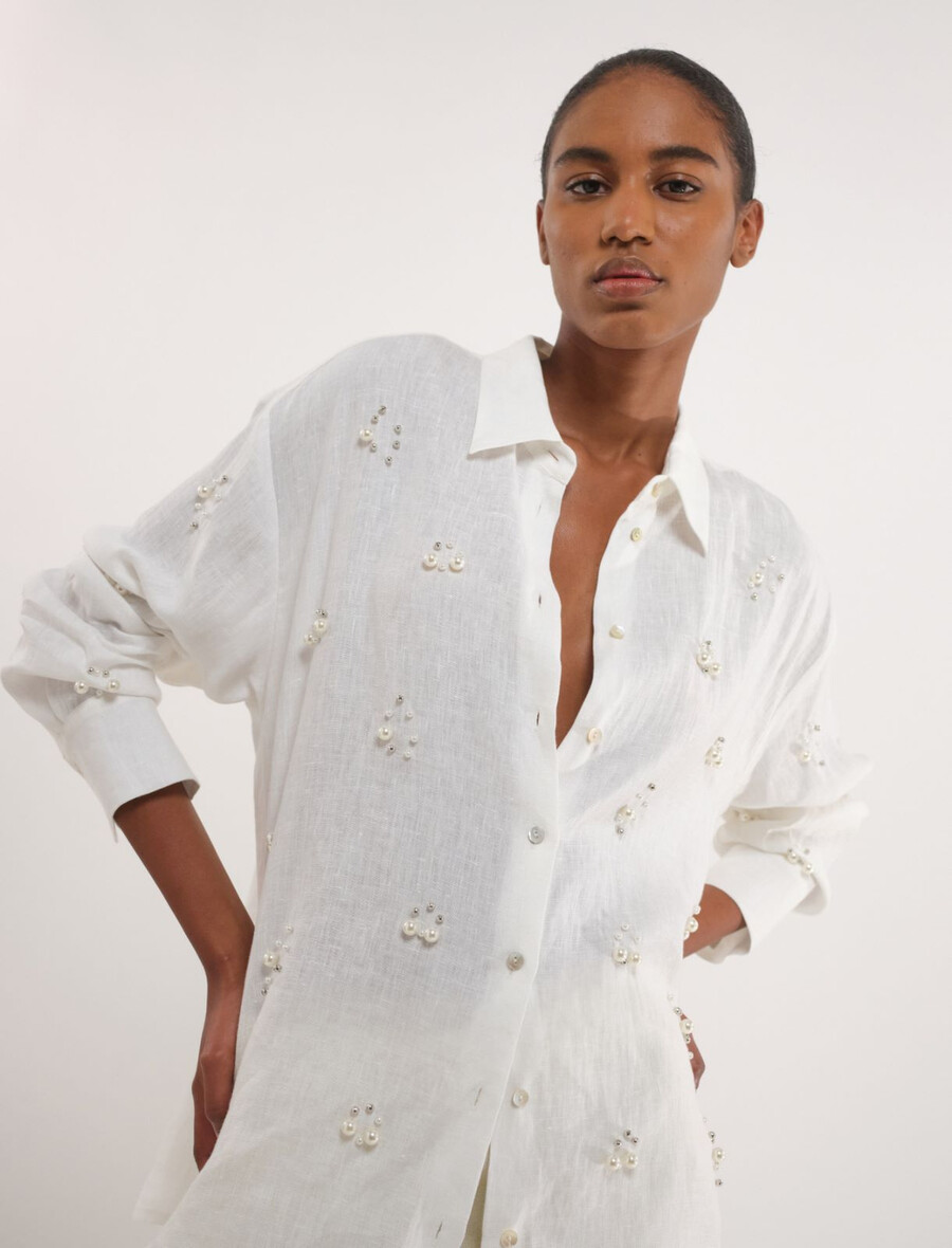Kul različica lanene srajce z oprijetim krojem, spuščenimi rameni in bleščečim vezenjem, biseri in čepki. Za popoln mestni videz dodajte bižuterijo in padajoče hlače.