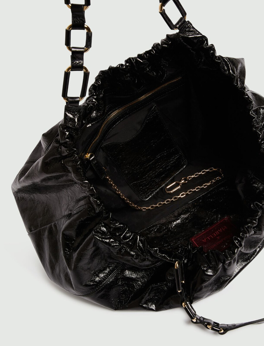 - Nakupovalna torba iz sijočega usnja z videzom razpokanosti in podlogo iz žakarda z blagovno znamko