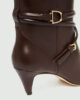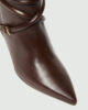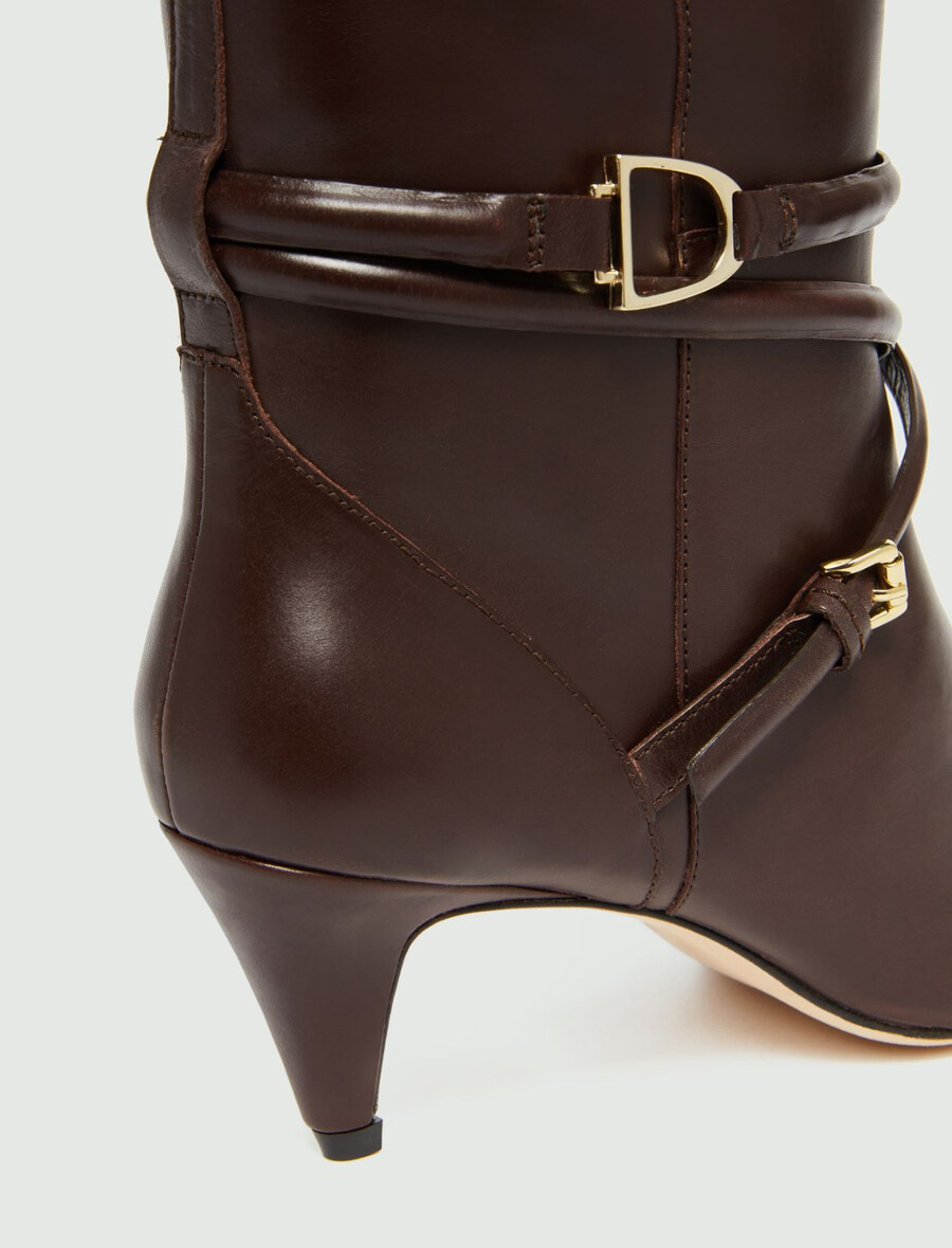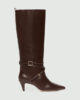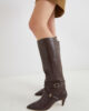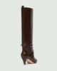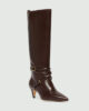 Novi usnjeni škornji, ki segajo pod kolena, so okrašeni s tkanim trakom na gležnju in svetlimi kovinskimi zaponkami. Pokrita peta zoži silhueto, hkrati pa s svojo višino 5,5 cm zagotavlja udobje in stabilnost.