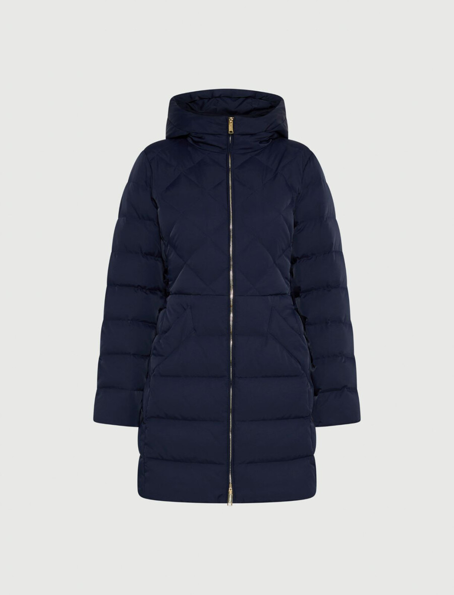 - Puhovka iz mat vodoodbojne tehnične tkanine z oblazinjenjem iz gosjega puha in podloženo notranjostjo