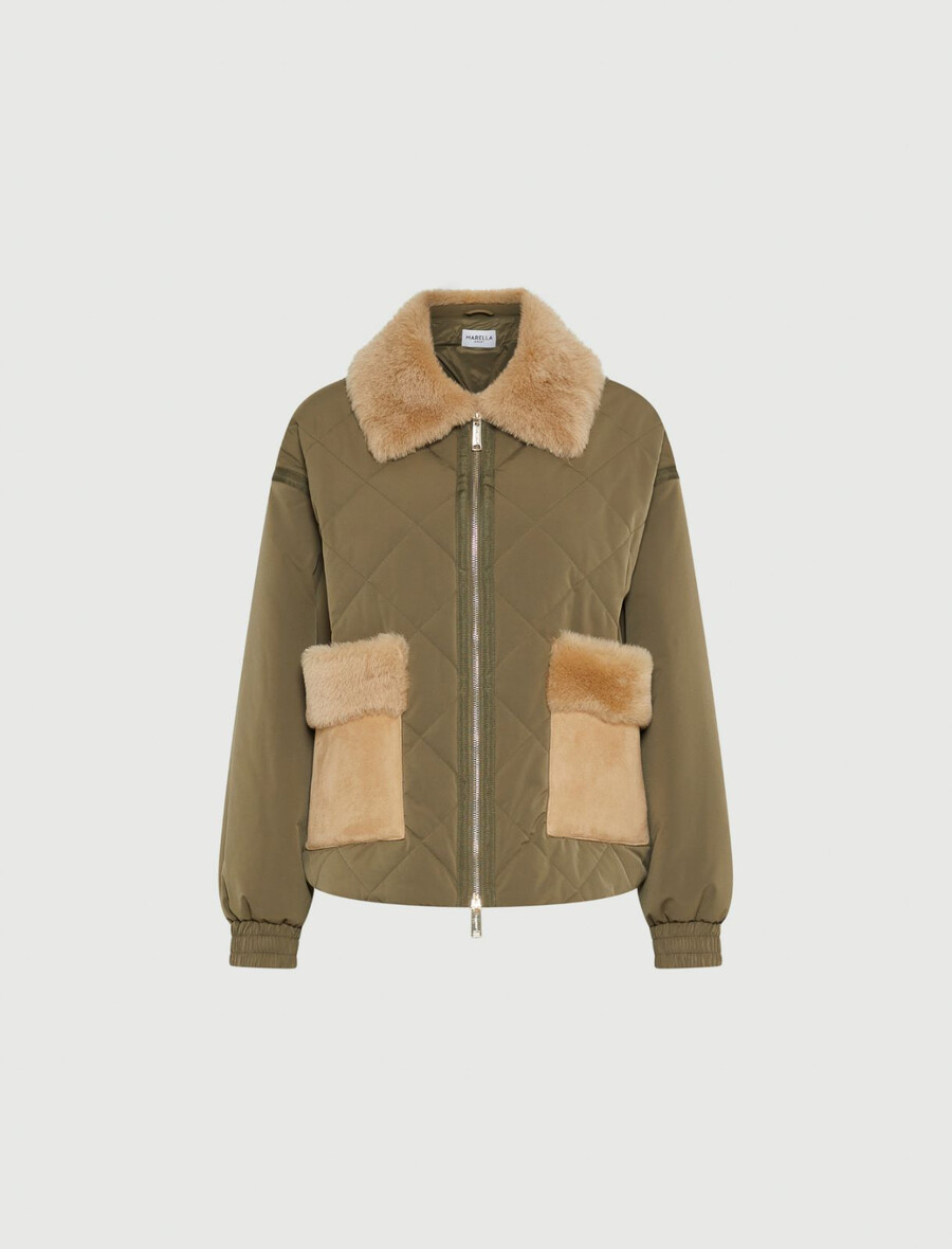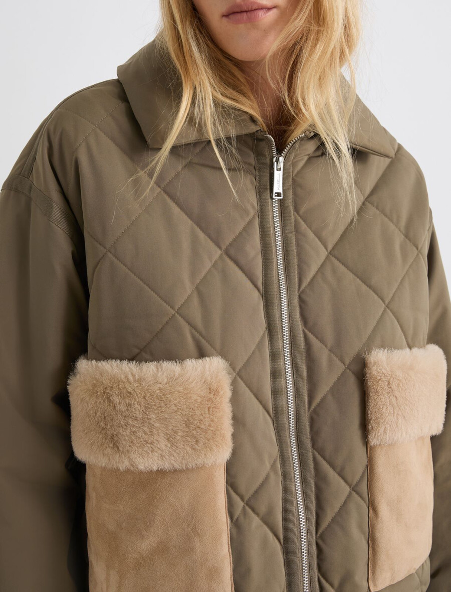 - Podložena težka jakna iz vodoodbojnega tehničnega platna s prešitim zgornjim delom