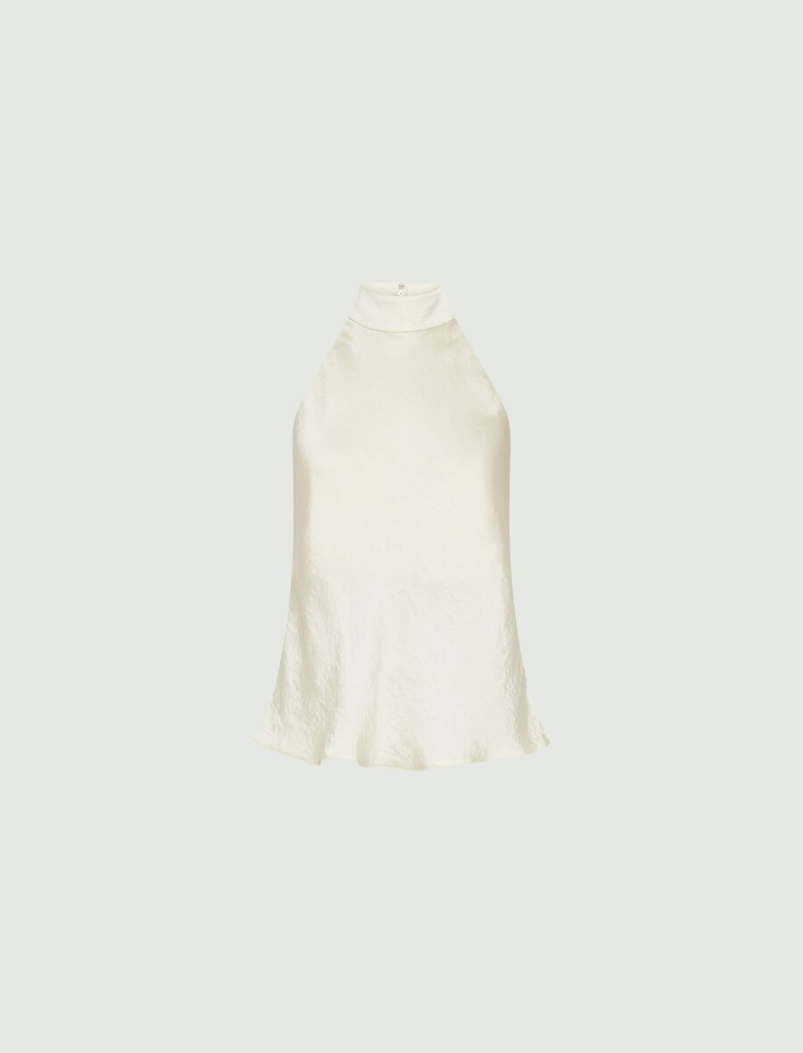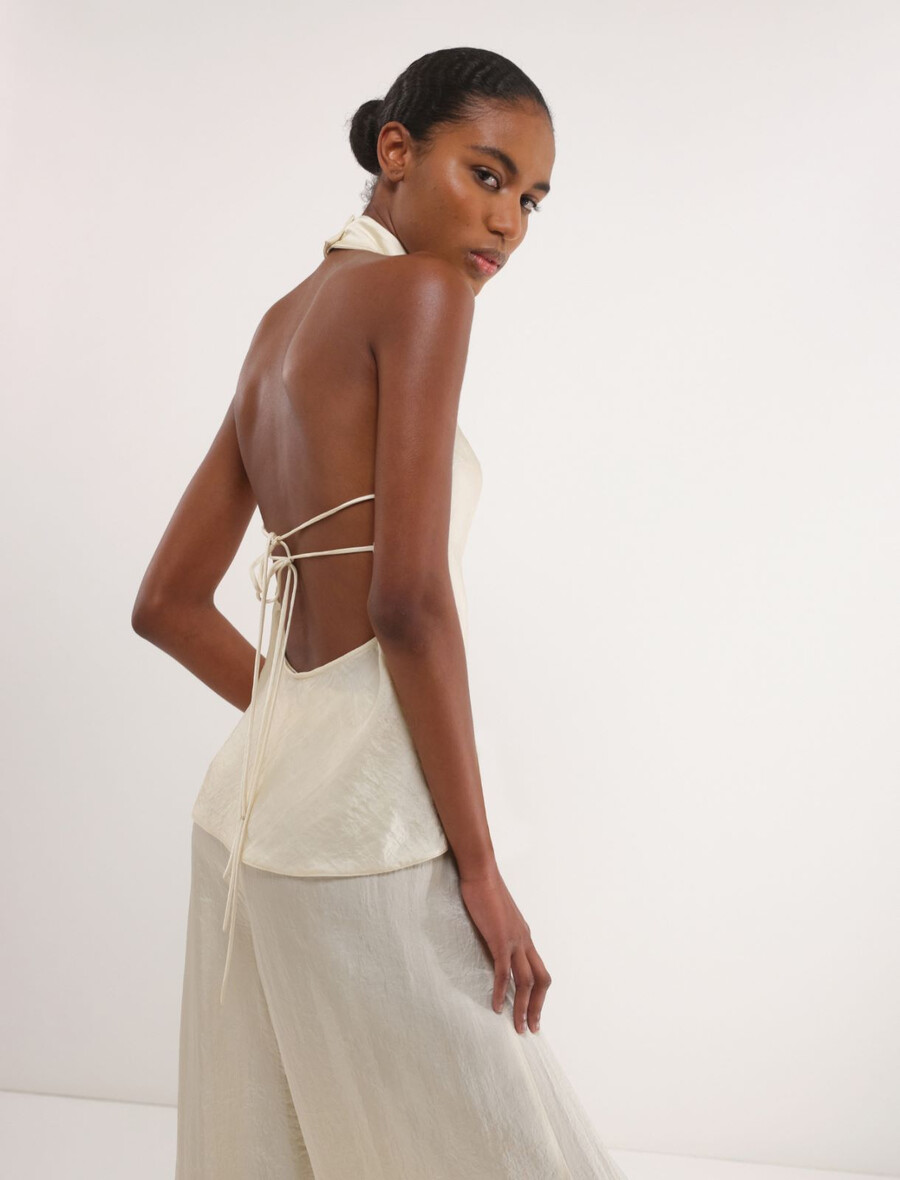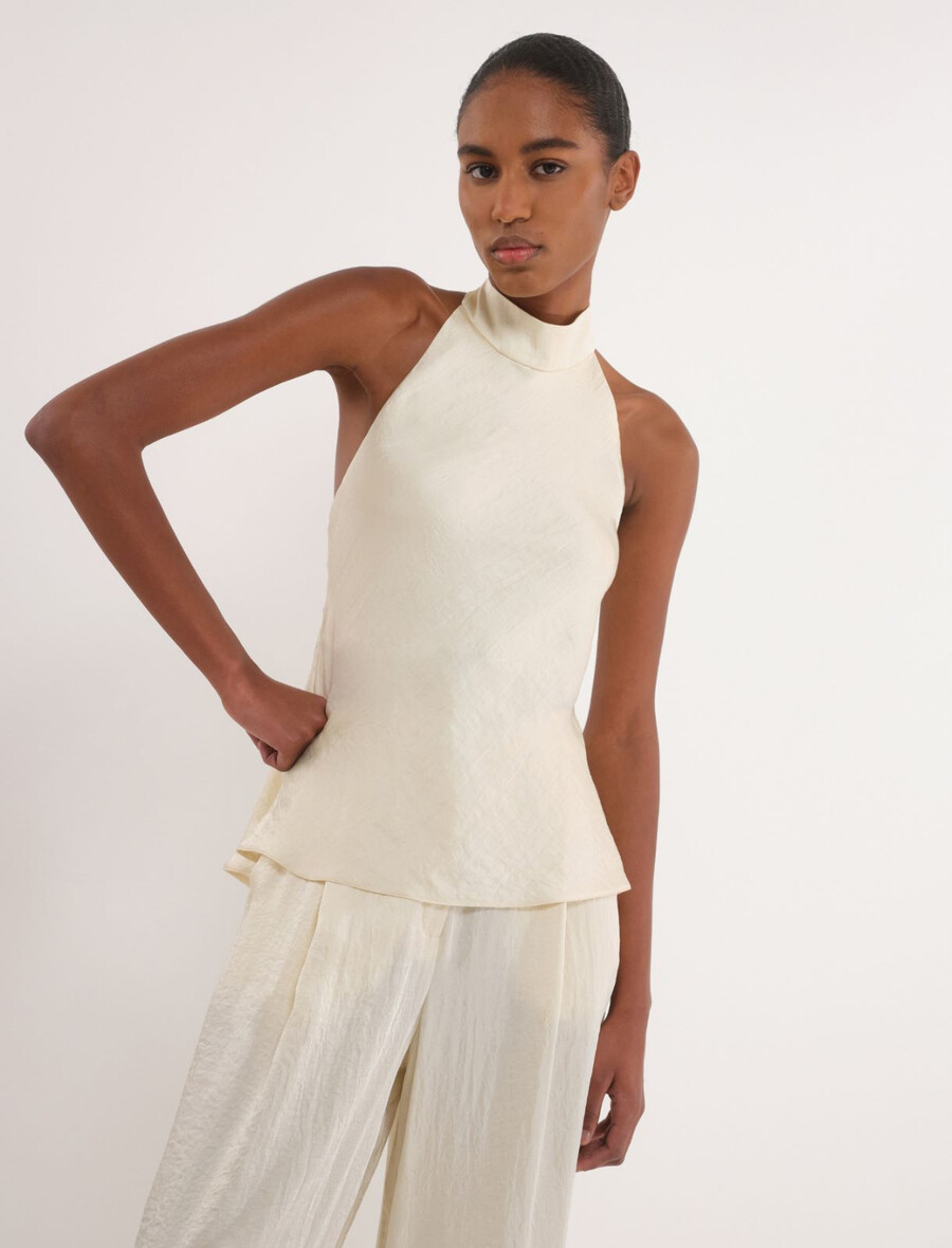 Ta novi padajoči top z ovratnikom na hrbtu razgali ramena in bo zagotovo pritegnil poglede. Gubast učinek blaga doda prefinjen pridih, zaradi česar je oblačilo popolno za najbolj šik priložnosti.