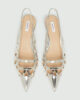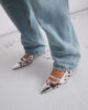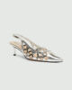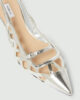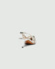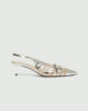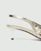 Ti čevlji z zrcalno poliranim zaključkom se ponašajo s kletko iz srebrne niti, ki se ovija okoli prstov in podaljšuje silhueto. Pašček in peta z lakiranim vzorcem v tonu kože dodajata popoln ženstven pridih podnevi in zvečer.